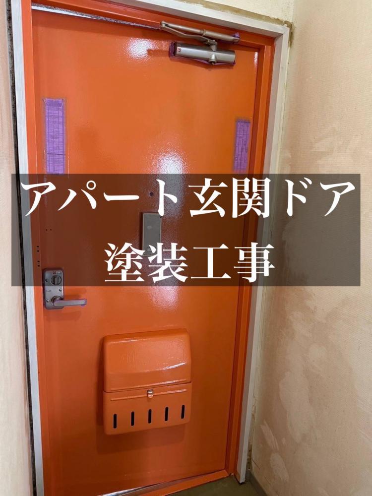 アパートの玄関ドア塗装工事を行いました!塗装が剥がれボロボロになってしまったドアが目を見張る様な明るいオレンジ色に!ドアの開閉の度に気持ちが明るくなるような色ですね