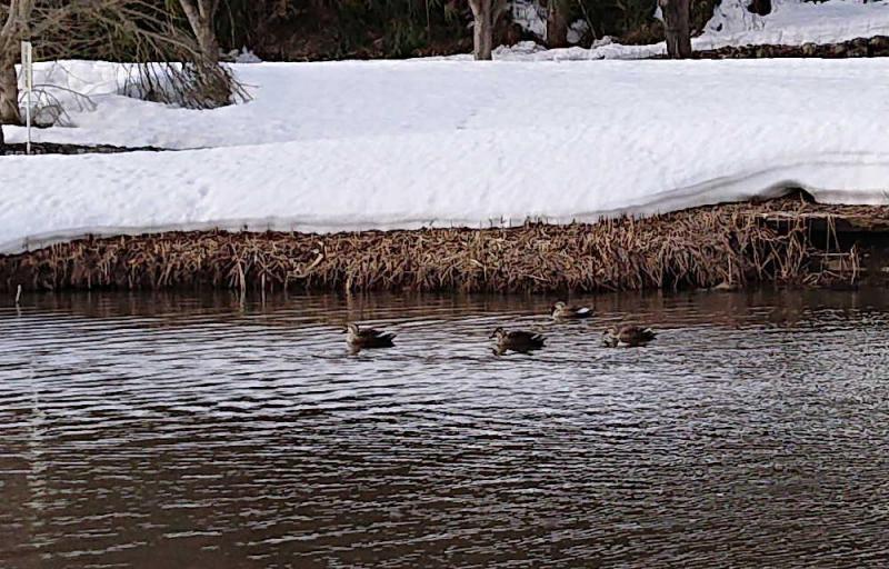 ●カモがゆったりと泳いでいます 今日も暖かい一日となりそうです 暖かさに誘われて木々の芽もふくらんできそうです 雪もどんどん解けてきました庭にはほとんどなくなりました 庭いじりも楽しみです
