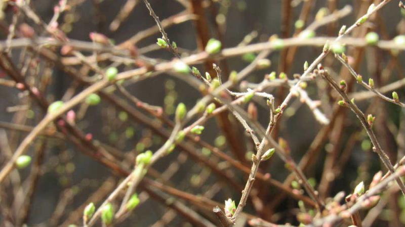 ●ユキヤナギの芽 庭木の雪囲い(といっても囲うほどの花木ではありませんが)を外しました 外した雪囲いの中から淡い黄緑色の芽が飛び出してきました 春を告げてくれるかのように「ユキヤナギ」の細い枝にたくさんの芽が付いていました 開花まではまだまだ先ですが春の息吹を感じさせてくれる「ユキヤナギ」の新しい芽です