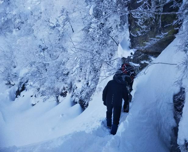 天元台高原の水源となる西吾妻地蔵倉、標高1,555m 西吾妻の岩盤より湧き出るその水がでなくなったのが2月末、調査の結果、岩盤からは水が流れており、それを受ける槽には水がある、そこから500m下の受水槽には水が流れてなく、その間のどこかで配管の凍結、ごみつまりとか破損なども考えられる・・もう少し場所特定を調査するも、あまりの雪で断念、とりあえず生活用水確保のため、簡易でバイパスする配管を敷設する方針となり一昨日、1640mホワイト休憩所から下り、岩盤を迂回して水源にたどり着く、水源となる受水槽は17日からの雪でまた埋まっているの・・・除雪して配管設置の方策を下見検討する、水道屋の社長も同行してもらった・・さて今日明日と作業は終わるのか??私は明日、明後日とお手伝いとなる・・
