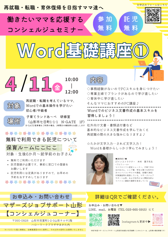 コンシェルジュPC講座「ワードの基礎スキル@」を開催します!◇:*:☆:*:◇:*:☆:*:◇:*:☆:*:◇:*:☆:*:◇Wordの基本的な機能と操作方法をお伝えします。表の作成や編集、文章の編集など実際にパソコンを触って自分のパソコンスキルをチェックしてみませんか?効率アップのワザを習得し、強みにしよう!簡単なチラシ作りにも挑戦してみましょう! 【日時】 4月11日(金) 10:00〜12:00 【会場】 子育てランドあ〜べ 研修室【定員】 10名【託児】 あり 定員があります お早めにご予約ください【受講料・託児料】 無料 ご興味のある方はお早めにお気軽にお問合せください♪お問い合わせマザーズジョブサポート山形【コンシェルジュコーナー】TEL:023-665-5915お申込みメールはコチラLINEはトーク画面にて「お名前、お申込み講座、託児の有無、お電話番号」を送信してください