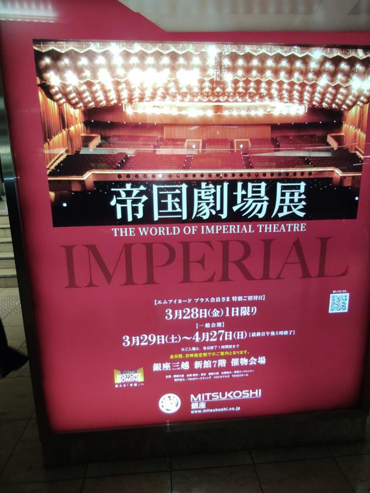 TOKYOには、美容に関することや、その他の学びのために年に数回行きますがその際には、せっかく行くのだから何かと観てくるものもあります…今回は、銀座三越で行われている帝国劇場展一度も帝国劇場には、足を踏み入れた記憶がないのだけれど帝国劇場が、2月に閉館し5年後にまた、別の帝国劇場が、現れる…というのであれば帝国劇場に行っておけば良かったぁ!とそれが心残りです…歴史ある この劇場で繰り広げられた様々な舞台がたくさんの人の心に熱き感動を与えたことと思います…あと5年 新生帝国劇場 を待たなくてはなりません…【レ・ミゼラブル】で閉じた帝国劇場は、5年後に【レ・ミゼラブル】で幕を開けるのだろうか?絶対に観てみたいミュージカルです!24年から25年に掛けて地方公演もあるらしいのだけれど… なかなか行けない場所ばかりでした。TOKYO公演の際に行っておけば良かったぁ…この先もやはり健康で無ければ足を運ぶ事も出来なくなります。せめて銀座三越で開催されている帝国劇場展を観たいと思い、今回 事前にチケットを購入して行って観ました…3月28日は多分三越会員さん優先のDAY29日は、一般初日…3月28日から4月27日まで開催されます。大正時代に一世を風靡した広告コピーには【今日は帝劇、明日は三越】三越は帝国劇場と共に歴史を歩んで来たようです。内容は…芸能人が、舞台で着用した衣装や帝国劇場にあった椅子帝国劇場の歴史年表昔の広告 帝国劇場出演の際の舞台の座長部屋を再現帝国劇場の想い出を語った一般の人からのメッセージ…etsetoraマイフェアレディーを演じた時の 大地真央さんの衣装がありましたがこんなにも細いボディをしているのかと 感心するほどかなりスレンダーな衣装でありました。素晴らしいボディコントロールです…前売りチケットは2800円当日チケットは、3000円記念の何かが付いたら3500円です…内容を考えたらめちゃくちゃ高い!それなのに、どんどん人がやってきます。1時間に3回 時間で入れてそれが1日27回1回で60人を入れるので1日最低金額を算出しても4536000円この金額を約1カ月行うので最低、13,608,000円一億以上の売り上げが確実にある…TOKYOって凄い!目黒の桜でも観に行けば良かったぁ…プライスつけるなら 私なら1500円位でした‥山形市南館2の1の8心と身体のリラクゼーション眠れる森023‐646−8633