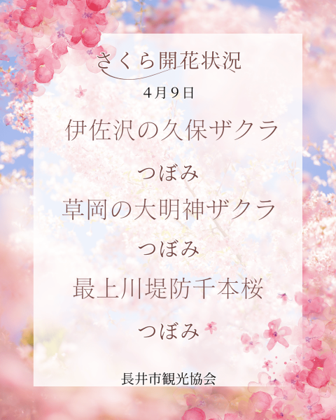 〜長井市内の桜の情報をお知らせします〜 現在、置賜さくら回廊の長井市の桜は最上川堤防千本桜…つぼみ伊佐沢の久保ザクラ…つぼみ草岡の大明神ザクラ…つぼみ 今日現在まではまだつぼみの状態です。当協会調べでは、開花予想は4月18日以降〜見頃はそこから約1週間ほどかかるかと思われます。 今年は雪が多かったことと、気温が低かったことが影響し例年より開花が少し遅れている状況になります。つぼみが赤く膨らんできたら、また情報をお伝えさせていただきますので今しばらくお待ちいただけますと幸いです。 開花状況はコチラからご確認ください→→置賜さくら回廊HP是非「置賜さくら回廊」へ、そして長井へおいでください! 桜の期間中はInstagramをメインに、開花状況をお知らせしていきます! ☆.。.:*・°☆.。.:*・°☆.。.:*・°☆☆.。.:*・°☆.。.:*・°☆.。.:*・°☆見頃予想や最新状況などは、随時こちらの「長井市ポータルサイト」でお知らせします!是非チェックして下さいね!!置賜さくら回廊や長井市の観光パンフレットの送付も行っております。ご希望の方はこちらからお気軽にお問い合わせください! 【長井市観光協会 公式アカウント】長井市観光協会ではFacebook・Instagramのアカウントを作成しております。桜、白つつじ、あやめの開花状況をお知らせする他、イベントの情報発信を行う予定です。是非お目通しくださいませ(*^ω^*)!!FacebookInstagram☆.。.:*・°☆.。.:*・°☆.。.:*・°☆☆.。.:*・°☆.。.:*・°☆.。.:*・°☆