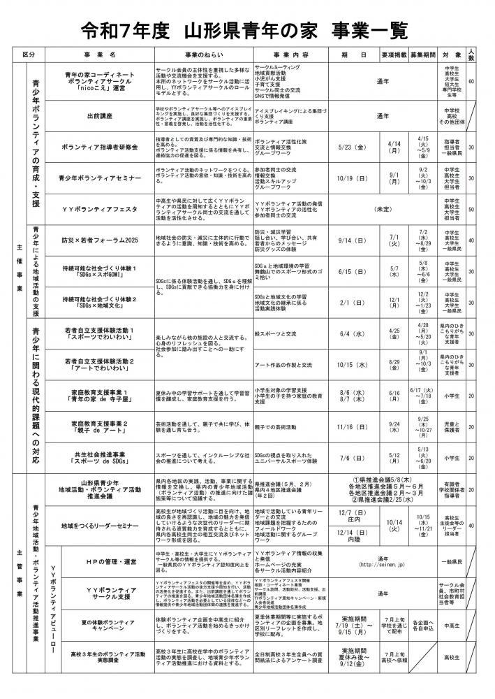 令和7年度 山形県青年の家「事業一覧」を掲載いたします。詳細は↑上記のPDFをご覧ください。 青年の家では、「青少年ボランティアの育成・支援」だけにとどまらず、「青少年による地域活動の支援」および「青少年に関わる現代的課題への対応」に関するさまざまな主催事業を予定しております。各事業の開催要項やチラシは、以下のサイトで随時掲載していきます↓ 青年の家HP:https://www.pref.yamagata.jp/701005/bunkyo/wakamonoseishounen/kyouikushisetsu/seinennoie/index.html X(旧Twitter):https://x.com/seinen_yamagata Instagram:https://www.instagram.com/seinen_yamagata/ 主催事業への参加はもちろん、各種研修や体育館利用等でも青年の家をご利用ください♪お待ちしております!