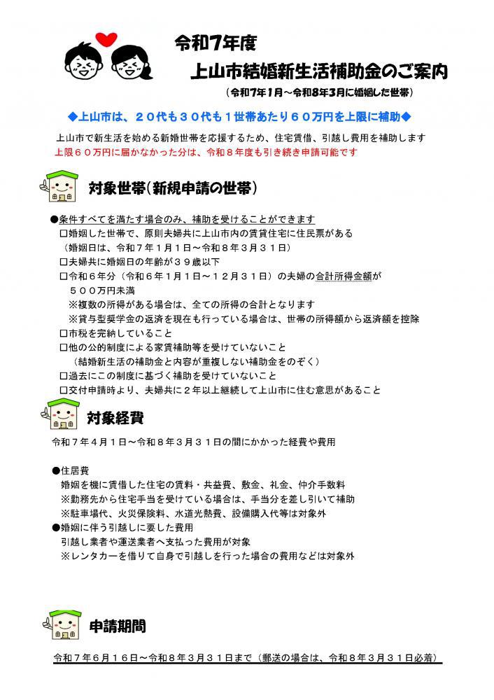 新婚世帯の方が賃貸住宅に居住する際に、かかったご契約費用やお引越し費用を補助する事業になります。(令和7年1月1日から令和8年3月31日までの間に婚姻届を提出し、受理されたご夫婦で一定の要件を満たす世帯が対象です。) 市ホームページ、結婚サポートかみのやま内の該当箇所をご参照ください。https://www.city.kaminoyama.yamagata.jp/soshiki/8/kekkonn-sinseikatu.html 上山市役所 福祉課 地域福祉係 まで023-672-1111(内線147)
