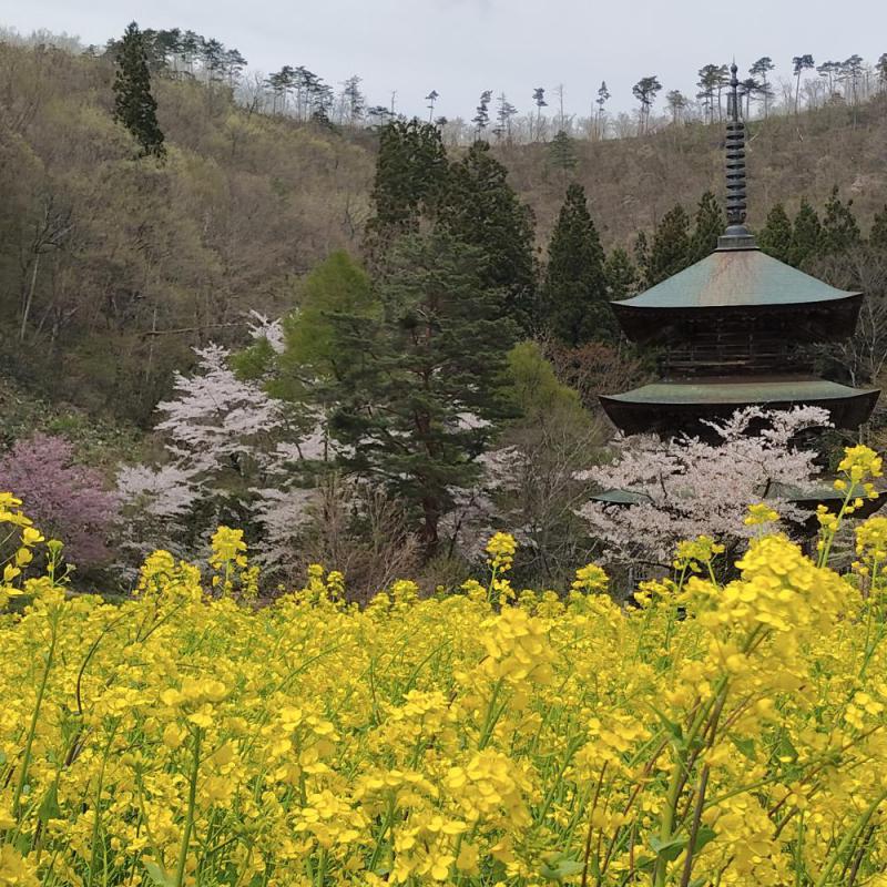 高畠町の安久津八幡神社の三重塔と菜の花と桜。
