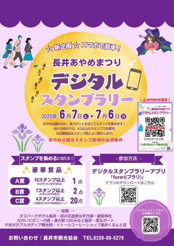 長井あやめまつり デジタルスタンプラリー【まつり開催期間:2025年6月10日(火)〜7月6日(日)】 デジタルスタンプラリー開催期間/ 2025年6月7日(土)〜7月6日(日)長井市では、あやめ公園のほか、長井市内各スポットを巡るスタンプラリーを実施します!【スタンプスポット数/11カ所】「米沢牛」や「お米」のほか、様々な賞品が当たるチャンス!☆楽しみながら長井を巡って豪華賞品をGETしよう♪ ≪ 参加方法 ≫1.スマホでユーザー登録 (チラシのQRコードもしくはこちら)2.おすすめスポットへGO!3.スポットにある二次元コードを読み込んでスタンプをGET!4.スタンプを集めてA賞・B賞・C賞に応募スマホで各スポットに設置されたQRコードを読み取ってスタンプを集めます(全11カ所のうち、4つ以上のスタンプで応募可)※取得スタンプ数により応募数が異なります。 長井あやめ公園はスタンプ必須ポイントになります! ★A賞【10スタンプ以上】 米沢牛(1万円相当)… 1名様※写真はイメージです ★B賞 【7スタンプ以上】 お米(5,000円相当)… 2名様※写真はイメージです ★C賞 【4スタンプ以上】「地場産品セット」のほか数多くの下記の賞品の中から当たります!※写真はイメージです。特別賞は下記も含め、様々な賞品が当たります! 【ご協賛店(施設)及び賞品のご紹介】・總宮神社/愛の御朱印帳 見開き版(1) /片面版(3)・卯の花温泉 はぎ乃湯/入浴券5枚綴り(5)・道の駅川のみなと長井/(中央青果)山形県産プレミアムサンふじジュース(2)・市民直売所 おらんだ市場 菜なポート/菜なポート商品券2,000円分(1)・タスパークホテル長井/お惣菜ビュッフェ ペア3組 (計6名様)・ドトールコーヒーショップ 長井くるんと店/ソフトクリーム(ミルク)1個引換券(5) ・野川まなび館(やまがたアルカディア観光局)/アルカディアはちみつ(1) スマホで簡単!スタンプラリーはもちろん参加無料!アプリ【furari】(ふらり)をダウンロードし、各スポットに設置された『QRコード』を読み込むとスタンプをゲットできます ▼まずはアプリをダウンロード▼(無料) iPhoneの方はコチラ → App Store androidの方はコチラ → Google Play スタンプスポット一覧 【11か所】1. あやめ公園 ※必須スタンプポイント2. 總宮神社 3. 文教の杜ながい/丸大扇屋4. 卯の花温泉 はぎ乃湯5. 道の駅川のみなと長井6. 旧長井小学校第一校舎7. 市民直売所 おらんだ市場菜なポート8. タスパークホテル長井9. ドトールコーヒーショップ長井くるんと店10. ながいピオニーの森11. 野川まなび館 ※応募には 1.あやめ公園 のスタンプ取得が必須条件となります実施期間は【2025年6月7日(土)〜7月6日(日)】もし、あやめの花の見頃が過ぎた後でも継続してチャレンジ、多くのスポットでスタンプをGETできるチャンスです♪☆楽しみながら長井を巡って豪華賞品をGETしよう♪ぜひお気軽に、多くの皆様のご参加をお待ちしております♪