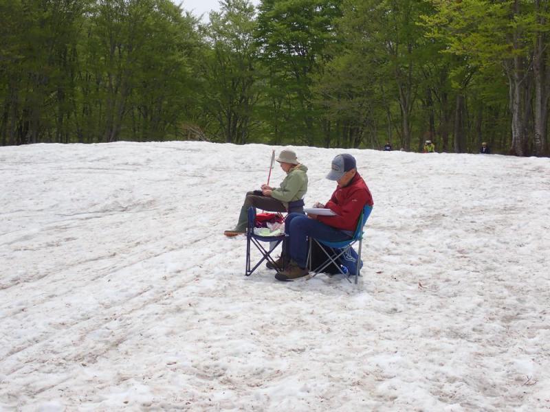 国民宿舎月山荘跡地は異常積雪で盛り上がっていました。携帯用のデスクを使い雪上でないと味わえない沼の風景には、真剣さが溢れていました。故斎藤さんは良く月山荘を描いておられました。私自身6年間ここでお世話になりました。