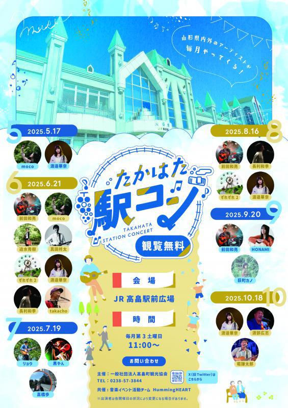 大陽館(JR高畠駅)前広場にて今年も始まります!たかはた『駅コン!』県内外から新進気鋭のアーティストが集まります!太陽館(JR高畠駅)の温泉に入ったり、レストランでご飯を食べたり、ぜひ高畠を楽しみながらご参加ください!〇入場・観覧無料〇会場 JR高畠駅前広場(東口) 〒999-2173 山形県東置賜郡高畠町山崎200−1 ※お車でお越しの際には駅の無料駐車場をご利用ください ※雨天時は駅コンコース・連絡通路等で開催の予定です〇日時:令和7年5月〜10月まで 毎月第3土曜日午前11時頃〜第1弾 5月17日(土)第2弾 6月21日(土)第3弾 7月19日(土)第4弾 8月16日(土)第5弾 9月20日(土)第6弾 10月18日(土)-----------------------------------------------------------------------------------◆第5弾 9月20日(土)《出演》・前田和亮 ・HONAMI ・荻町カノ 公式サイト -----------------------------------------------------------------------------------◆第4弾 8月16日(土)《出演》・前田和亮 ・ずれずれ2 公式サイト ・渡邉華奈 公式サイト・長利和季 -----------------------------------------------------------------------------------◆第3弾 7月19日(土)《出演》・リョウ ・黒やん ・煖エ歩 -----------------------------------------------------------------------------------◆第2弾 6月21日(土)《出演》・前田和亮 ・moco 公式サイト ・迫水秀樹 公式サイト ・真田柊太 ・ずれずれ2 公式サイト ・渡邉華奈 公式サイト・長利和季 ・takacho -----------------------------------------------------------------------------------◆第1弾 5月17日(土)《出演》・moco 公式サイト・渡邉華奈 公式サイト・堀謙太郎 公式サイト-----------------------------------------------------------------------------------◆お問合せ主催:一般社団法人高畠町観光協会 TEL 0238−57−3844共催:音楽イベント活動チーム HummingHEART