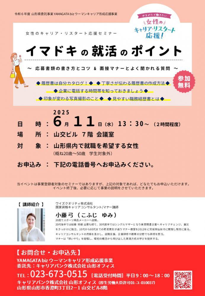 応募書類がなかなか通らない面接でいつも落とされてしまう・・・。など 就職活動が上手くいかないなど、お困りがある方は、応募から面接までの対策に備えるセミナー「イマドキの就活のポイント」に是非ご参加ください。 どのようにしたら印象の良い応募書類になるのか、また好感度アップになるマナーや、面接のポイントなど応募前に押さえておくと、合格率がアップするかもしれません。 参加ご希望の方は、お電話にてお申込みください。 【お申込み先】キャリアバンク株式会社 山形オフィス023-673-0515 (女性支援担当宛) 【電話受付時間】平日 9:00〜18:00 日時 6月11日(水)13:30〜(2時間程度)会場 山交ビル7階 会議室(駐車場は、山交ビル指定の駐車場をご利用ください。) お気軽にお電話ください。お待ちしています。
