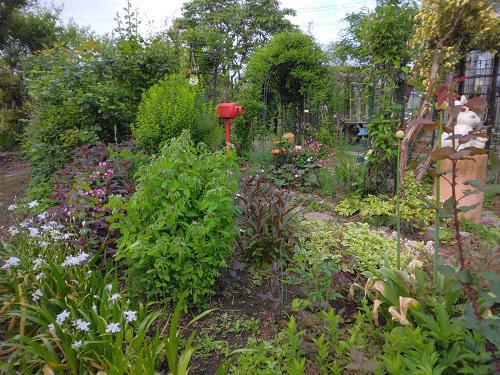 朝から日差しが強かったり、寒かったりで毎日不安定な天気が続き身体も花達もついていけない毎日です。昨日は曇り空でしたが、いい感じの庭が撮れました。今年の花の開花は、かなり遅れていてきれいな庭が見れるのでしょうか?先日の強風で青のパーゴラが倒壊し、すっかり庭の風景が変わりましたが自然で広い感じがしませんか? ↓自宅側から〜真ん中のブッドレアを支えている横のバー(棒)がちょっと気になりますが、じーじは仕方がないと言っています…(トレリスの補強) ばーばの花壇は〜 ↓ヒューケラをメインに造った花壇ですがピンクの花を付けているヒューケラは”プラムカスケード“ではないかと思いますが、購入したときは紫系の葉色で選びました。花期が長くていい役目をしてくれています。後ろには、”キョウカノコ”、株分けで簡単に増やせる花ですが今年は背丈がひょろっと高いような… 『クレマチス』もやっと開花デス! ”エンプレス” ↓栗の古木に白い”モンタナ” 花数も少なめ…秋に剪定し過ぎたようです。 『バラ』もやっと開花デス! 一番咲きの花〜“サハラ”例年一番の“コーネリア”に今年は勝ちました。