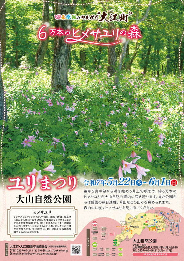 【2025年】大山自然公園ユリまつり|約6万本のヒメサユリが咲き誇る絶景2025年5月22日(木)から6月1日(日)まで、山形県大江町の「大山自然公園ユリまつり」が開催されます。約6万本の可憐なヒメサユリが咲き誇る絶景を見に、初夏の大江町へ出かけませんか?大山自然公園ユリまつり可憐に咲き誇る約6万本のヒメサユリ山形県大江町の大山自然公園では、毎年恒例の「大山自然公園ユリまつり」が今年も開催されます。宮城・山形・福島3県の東北南部と新潟県の一部にしか見られない貴重なヒメサユリ約6万本が、可憐に咲き誇る光景は圧巻です。 開催概要 日時2025年5月22日(木)〜6月1日(日) 場所大山自然公園 (山形県西村山郡大江町) 入場料無料 まつりのポイント 約6万本のヒメサユリ園内を埋め尽くすように咲く、ピンク色の可憐なヒメサユリの群生を楽しめます。 楽しい抽選会観光案内所で募金にご協力いただいた方は、素敵な景品が当たる抽選会に参加できます。 観光案内所ガイドが常駐し、パンフレット配布や観光グッズの販売を行います。(10:00〜15:30) 関連情報公式サイトはこちら大江町観光物産協会HP大江町の観光パンフレット周辺の魅力もチェック!{"@context":"https://schema.org","@graph":[{"@type":"Event","name":"大山自然公園ユリまつり","startDate":"2025-05-22","endDate":"2025-06-01","eventAttendanceMode":"https://schema.org/OfflineEventAttendanceMode","eventStatus":"https://schema.org/EventScheduled","isAccessibleForFree":true,"location":{"@type":"Place","name":"大山自然公園","address":{"@type":"PostalAddress","addressLocality":"大江町","addressRegion":"山形県","addressCountry":"JP"}},"image":["https://ssl.samidare.jp/~lavo/yamagatakouiki/box/IMG_5033%281%29.jpeg"],"description":"山形県大江町の大山自然公園で開催される、約6万本のヒメサユリが咲き誇るお祭り。観光案内所でのガイドや抽選会も楽しめます。","organizer":{"@type":"Organization","name":"大江町観光物産協会"}},{"@type":"Article","mainEntityOfPage":{"@id":"https://yamagata-kouiki.info/"},"headline":"【2025年】大山自然公園ユリまつり|約6万本のヒメサユリが咲き誇る絶景","author":{"@type":"Organization","name":"やまがた広域観光協議会","url":"https://yamagata-kouiki.info/"},"publisher":{"@type":"Organization","name":"やまがた広域観光協議会","logo":{"@type":"ImageObject","url":"https://yamagata-kouiki.info/images/logo.png"}},"datePublished":"2025-05-20T10:00:00+09:00","dateModified":"2025-09-18T07:00:00+09:00"}]}document.addEventListener("DOMContentLoaded", () => { const sections = document.querySelectorAll(".section-fade"); const observer = new IntersectionObserver( entries => { entries.forEach(entry => { if (entry.isIntersecting) { entry.target.classList.add("visible"); observer.unobserve(entry.target); } }); }, { threshold: 0.1 } ); sections.forEach(section => { observer.observe(section); }); });.aikiji_honbun{font-family:'M PLUS Rounded 1c',sans-serif;background-color:#f8fbf8 !important;color:#333;font-size:16px;line-height:1.8;padding:20px;}.hero-section{position:relative;margin-bottom:50px;border-radius:12px;overflow:hidden;box-shadow:0 6px 20px rgba(0,0,0,0.2);height:300px;}.hero-background-image{width:100%;height:100%;object-fit:cover;position:absolute;top:0;left:0;z-index:1;}.hero-text{position:relative;z-index:2;display:flex;flex-direction:column;justify-content:center;align-items:center;height:100%;background:rgba(0,0,0,0.3);text-align:center;padding:20px;}.section-wrapper{margin-bottom:50px;}.section-title{font-size:1.6em;font-weight:bold;color:#333;margin:50px 0 25px 0;padding-left:15px;border-left:5px solid #E91E63;display:flex;align-items:center;}.section-title i{margin-right:12px;color:#E91E63;}.info-box{background-color:#fff;border:1px solid #F48FB1;border-left:5px solid #F06292;border-radius:8px;padding:20px;}.info-box ul{list-style:none;padding:0;margin:0;}.info-box li{display:flex;align-items:flex-start;padding:10px 0;border-bottom:1px dashed #F8BBD0;}.info-box li:last-child{border-bottom:none;}.info-box i{font-size:1.2em;margin-right:15px;color:#E91E63;width:20px;text-align:center;padding-top:4px;}.info-label{font-weight:bold;display:block;margin-bottom:3px;}.highlight-grid{display:grid;grid-template-columns:repeat(auto-fit,minmax(250px,1fr));gap:20px;}.highlight-card{background-color:#fff;padding:20px;border-radius:8px;border:1px solid #eee;box-shadow:0 2px 5px rgba(0,0,0,0.05);text-align:center;}.highlight-card i{font-size:2.5em;color:#E91E63;margin-bottom:10px;}.highlight-card h4{font-size:1.2em;font-weight:bold;color:#333;margin:0 0 5px 0;}.highlight-card p{font-size:0.9em;margin:0;color:#555;}.related-links{display:grid;gap:15px;}.related-card{display:flex;align-items:center;justify-content:space-between;background-color:#fff;padding:15px 20px;border-radius:8px;border:1px solid #ddd;text-decoration:none;color:inherit;transition:transform 0.3s,box-shadow 0.3s;}.related-card:hover{transform:translateY(-3px);box-shadow:0 6px 12px rgba(0,0,0,0.1);}.related-card-content strong{font-size:1.1em;color:#333;display:block;}.related-card-content span{font-size:0.9em;color:#555;}.related-card i{font-size:1.2em;color:#E91E63;}