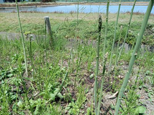 我が家のアスパラ、これも昨年からすると10日は遅いです、連休明けには出てましたがね今年は5月中過ぎでした、ほんの少しの場所、昨日ようやく周りの草刈り終わりました。畑の苗植えが一段落、トウモロコシと枝豆もポットに種植えおわったのでようやく草刈りしましたが、果樹の手入れにその周辺草刈り終わらずでした、そうこうしてると畑のツルモノ箇所の土むき出し部、あっという間に雑草出るのでシートしくか、マルチ敷きもしないとですね・・