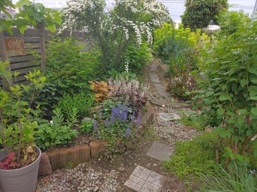 昨日の長井の最高気温は30.4℃!!30度越えの真夏日に、花達もカラッカラ、、、2階の部屋も気温が上がり、窓全開しても暑くて、暑くて、、、まだ寒くて暖房入れている時もあるのに 今朝は、朝から小雨が降ってきて、晴れたと思ったら、お天気雨!庭仕事なかなか進まず・・・ 晴れ間を見て庭風景撮ってみました。毎日の庭の変化が気になり、ついついスマホでパチリ!咲き始めが一番きれいで感動的なのですが、ちょっと前に撮った写真は古くなってしまいブログネタもボツ多いです。 (トップ写真)は。。。 東側から、ロックガーデンの方向に向けて撮ってみました。左側には、先日のばーばの花壇(ヒューケラ)が見えます〜♪このエリアは秋庭が素敵な風景になります。 『キャットミントの小道』〜 キャットミントがようやく咲き始めました。ちょっとボケてしまいました… ↓その手前にはこぼれ種で元気に咲いている ”ポリジ”この場所がお気に入りのようで毎年ここだけは旺盛です! ↓まだ緑とブルー系の庭ですが、差し色で明るい花も仲間入りデス。ここのキャットミントは、昨日は咲いていなかったのですが、今朝はいつの間にか咲いてくれていました。 ↓咲き始めの一番きれいな時に撮った”バーバスカム” ちょっと前になりますが。 ↓クリの古木のそば、ミニガーデンの後ろにある”ハクロニシキ”美しい葉が魅力的です〜♪どこまで伸びる・・・?秋に、バッサリと剪定するのですが、切るほど伸びるようです。 バラは。。。 ↓ツルばらの”アンジェラ”一番目立つところにあるのですが、まだ咲き始めたばかりです。 ↓”コーネリア”もようやくです。