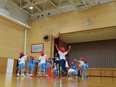 体育の授業で1・2年生がまり入れの練習をしていました。まりは、下から投げると入りやすいですね。