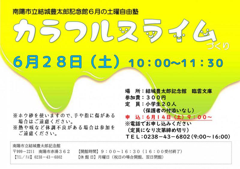 土曜自由塾は、6月〜12月の第4土曜日(変更あり)に行う小学生を対象とした講座です。つくるものは決まっていますが、その中で自分の好きなようにのびのびと楽しくつくります。 6月の土曜自由塾は カラフルスライムづくり です。申 込:6月14日(土)9:00から受付開始(電話でお申し込みください)TEL:0238−43−6802(9:00〜16:00)※定員(小学生20人)になり次第締切※ホウ砂を使いますので、手や指に傷がある場合はご遠慮ください。※熱や咳など体調不良がある場合は参加をご遠慮ください。