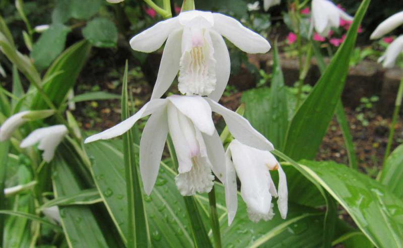 ●「この花は何という花?」俺は「シラン」 真っ白な花と赤紫色の花の「シラン」が庭の花壇を縁取るように咲いています わが国では古くから自生している花だそうですが 我が家の「シラン」は一昨年知人から数株いただいたものですが繁殖力が旺盛でどんどん増えています 暑さ寒さに強く秋には枯れてしまいますが翌春には芽を出し今頃花を咲かせる雪が降る当地方ではもってこいの草花です
