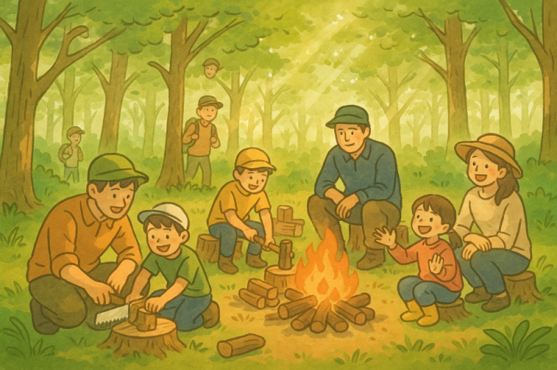 はじめに山には、人を育てる力があります。木々の間を歩き、薪を割り、火を起こす。それは学校では学べない、生きた体験です。子どもたちが初めて山に入るときの目の輝き、地域の人たちが久しぶりに山と向き合う時間。そこには、静かだけれど確かな「つながり」が生まれています。今回は、そんな“学び”と“交流”が芽吹く現場の物語をお届けします。自然の中で育つ、まなざしある日、小学校の体験学習で子どもたちが山を訪れました。最初は土の道を歩くのもおっかなびっくり。けれど、目の前に広がる大きな木、風の音、落ち葉の感触に、次第に夢中になっていきます。「この木が、薪になるの?」「山って、こんなに静かなんだね」そんな素朴な声が、私たちにはとても嬉しく感じられます。彼らは木を見る目を変え、山という存在を“遠いもの”から“身近な場所”へと感じはじめます。火を囲むという学び体験会では、実際に薪を割って火をつける活動も行います。自分たちで割った薪に火がつき、パチパチと音を立てる。その炎でご飯を炊いたり、スープを温めたりする──そんなシンプルなことが、子どもたちにとっては大きな経験になります。「自分で火をつけたら、ご飯の味が違った」「手伝ってもらいながらできた。嬉しかった」五感を通じた体験は、“生きる力”につながっていきます。火を囲んだあとの会話もまた、学びのひとつ。協力し合った仲間とのやりとり、地域の人とのふれあい。山の時間は、人の関係をゆっくり、そして深くつないでくれます。地域と山をつなぐ活動私たちは、親子での体験イベントや学校との連携などを通して、地域の人と山をつなぐ活動を続けています。「子どもと一緒に山に入るのは初めて」「昔はこうやって薪をつくっていた」そんな声が山の中に響き合い、世代を超えた交流が生まれていきます。山に関わるということは、木を使うだけではありません。その恵みに気づき、大切に思う“心”を育てることでもあります。山と暮らす地域だからこそできる体験を、これからも未来へつないでいきたいと考えています。おわりに山で過ごす時間は、子どもたちにとって宝物になります。それは、教室では学べない「生きる力」を育て、地域の人々にとっても「忘れていた大切な感覚」を呼び覚ます。木を伐るだけでなく、火を使うだけでもない。山は、学びとつながりを生み出す“場所”なのです。次回は、そんな山の営みを支える“見えない努力と技術”に光を当ててお届けします。どうぞお楽しみに。