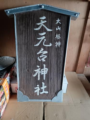 この冬、天元台はまれにみる大雪で、天元台ロープウエイ高原駅降りてすぐのところの天元台神社は建物も鳥居もすっぽりと雪の中、この2月ユンボで除雪中、神社表札が外れてしまった。特に環境の厳しい天元台高原ですし、長年の風雪で一部が欠損し、文字も見えにくくなりました・・そんで修理頼まれて、欠損部を同じような木を見つけてつないで、トタンや鋲はみな外して解体、塗装、文字も薄くなってるので、ルーターで掘って再塗装しました・・これは結構かかりました・・ニス染み込ませて、チョコブラウンで再塗装トタン部も打ち直しして夏営業前に間に合いましたね・・