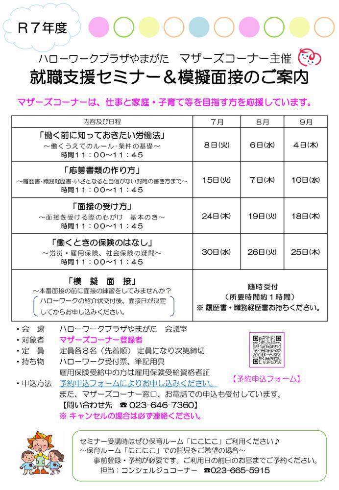 2025年、7月、8月、9月のマザーズ就職支援セミナー と模擬面接 のお知らせです!  【マザーズ就職支援セミナー】マザーズコーナー(ハローワーク)のスタッフが、毎月4つのテーマでご説明します。 ★『働く前に知っておきたい労働法』「賃金支払いのルールって?」「社会保険や雇用保険の加入条件は?」「育休は正社員じゃなくても取れる?」etc.求人票の項目に沿って、基本的なことをご説明します。【日時】7月8日(火)8月6日(水)9月4日(木) ★『応募書類の作り方』履歴書・職務経歴書・添え状…書き方に不安はありませんか?基本的な記載方法からマザーズ向けの好事例など分かり易くご説明します。【日時】7月15日(火)8月7日(木)9月10日(水) ★『面接の受け方』「書類は通るけど面接が…」や「面接は苦手…」と思われている方基本的なマナーや面接の流れを説明いたします。短時間ですが、参加された皆さんと一緒に入室・退室も練習予定です。【日時】7月24日(木)8月19日(火)8月18日(木) ★『働くときの保険のはなし』雇用保険、社会保険(健康保険、厚生年金)を加入する基準とは?よく耳にする「扶養の範囲内」で働くとどうなるの?働くときの保険について、基本的なことをご説明します。【日時】7月30日(水)8月26日(火)9月25日(木) ◎ 会場はいずれも  ハローワークプラザやまがた内 会議室◎ 時間はいずれも 11:00〜11:45◎ 託児:無料(事前予約が必要)◎ 定員:8名(先着順)◎申込み方法: マザーズコーナー窓口、または お電話でお申込みください※キャンセルの場合も 事前にご連絡ください。◎持ち物:ハローワーク受付票、筆記用具※雇用保険受給中の方は 雇用保険受給資格者証 【マザーズ模擬面接】スーツ着用で臨んでいただく本番面接を想定した面接です。ご希望の日時で事前にご予約ください。◎会場 ハローワークプラザやまがた内 会議室◎託児 無料(事前予約が必要)◎持ち物 ハローワーク受付票、筆記用具 履歴書の写 ※雇用保険受給中の方は 雇用保険受給資格者証  お問い合わせはハローワークプラザやまがたTEL:023-646-7360 託児ご利用の方はマザーズジョブサポート山形【コンシェルジュコーナー】までお問合せくださいTEL:023-665-5915