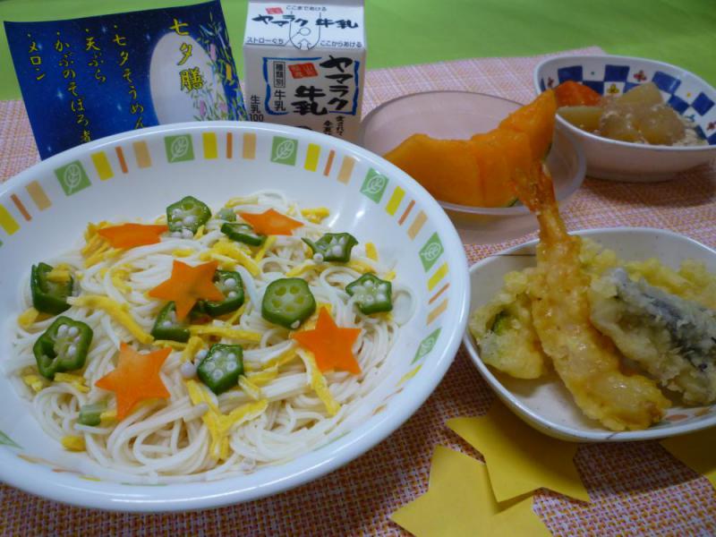 栄養課です。令和7年7月7日は七夕御膳を提供致しました。暑い日が続いているので、さっぱりとしたそうめんは人気があり、今年初物の庄内メロンもお出しして皆さん大喜びでした。皆様の願いが叶いますように。。。