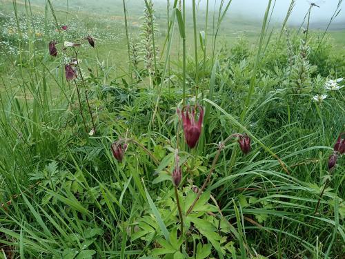 天元台の高原花壇、リフト下やゲレンデで見かけるヤマオダマキが咲いてきました,山地の草原に咲く多年草。苧環(オダマキ)とは糸を巻く道具。花の形がこの道具に似ているのでこの名がある。山の草原や林の縁に生える多年草です,