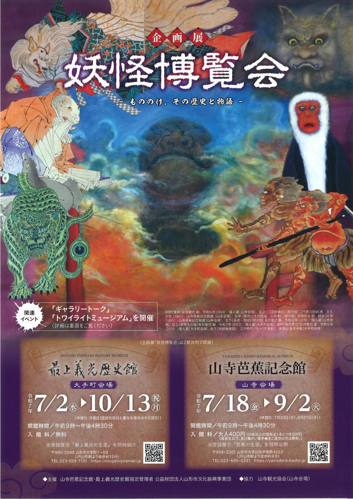企画展「妖怪博覧会 −もののけ、その歴史と物語−」(山寺会場)会期:令和7年7月18日(金)〜9月2日(火) (休館日:7月23日、8月27日) 妖怪は”もののけ”とも言われ、古来より様々な文学作品、美術作品に取り上げられてきました。妖怪が日本文化に与えた影響がいかなるものだったのか。その時代ごとの特徴がいかなるものだったか。 米沢市出身の伊東忠太の本や忠太の妖怪をもとにした作品も展示します。是非ご覧ください。お見逃しなく! 関連イベント☆トワイライトミュージアム☆日 時 令和7年8月3日(日)午後4時〜5時内 容 講演会「山形もののけ夜話」作家 黒木あるじ氏※終了後、午後6時30分まで観覧可能です。ごゆっくりご覧ください。場 所 山寺芭蕉記念館 研修室T定 員 50名(先着順)申込み 当日、受付でお申し込みください。(午後3時50分まで)参加費 入館料400円のみ(高校生以下、及び障がい者手帳をご提示の方は無料。) ☆ギャラリートーク☆日 時 令和7年8月10日(日)午後2時から(約25分)内 容 当館学芸員による展示解説申込み 事前申し込み不要参加費 入館料400円のみ(高校生以下、及び障がい者手帳をご提示の方は無料。)