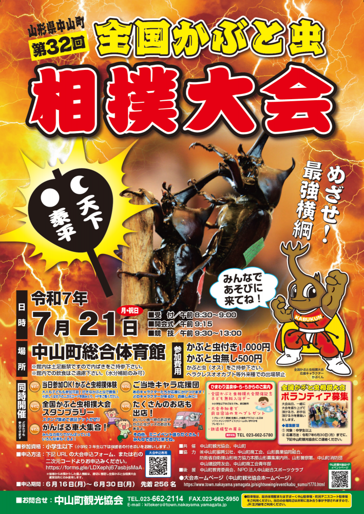 めざせ最強横綱!今年も中山町で熱き戦いが繰り広げられる!2025年7月21日(月・祝)、中山町で「第32回全国かぶと虫相撲大会」が開催!トーナメントの選手申込は終了しましたが、当日参加OKの相撲体験コーナーやお店も充実しており、家族みんなで楽しめます。令和7年度の選手申込みは6月30日をもって終了しました。たくさんのご応募ありがとうございました! 申込み不要!当日参加OKのかぶと虫相撲体験コーナー!大会に出場できなくても大丈夫!会場では、誰でも参加できる「かぶと虫相撲体験コーナー」を同時開催!観光協会のかぶと虫と勝負して、相撲の楽しさを体験しよう!※参加費無料。かぶと虫は会場でも購入できます。 大会概要 日時2025年7月21日(月・祝)海の日 受付 8:30〜9:00 / 開会式 9:15 / 競技 9:30〜13:00 場所中山町総合体育館 参加費(トーナメント)かぶと虫付き: 1,000円 / かぶと虫なし: 500円 参加資格小学生以下(小学3年生以下は保護者同伴) 賞品横綱(優勝者)をはじめ、入賞者には豪華賞品を用意! ご来場の皆様へのお願い 外来種(ヘラクレスオオカブト等)での出場はできません。 「かぶと虫なし」で参加する場合は、かぶと虫(オス)をご持参ください。 総合体育館は土足厳禁です。必ず内履きをご持参ください。 体育館アリーナ内での飲食はできません(水分補給のみ可)。 よくある質問 (FAQ) 大会申込みは終了しましたが、当日行っても楽しめますか?はい、もちろんです!申込み不要・参加費無料で楽しめる「かぶと虫相撲体験コーナー」や、おいしい食べ物のお店、グッズ販売など、ご家族で楽しめる催しが沢山あります。 かぶと虫を持っていなくても相撲体験はできますか?はい、できます。当日会場入口付近でかぶと虫(オス)をお買い求めいただけますので、その場で購入して相撲体験に参加することが可能です。 持ち物で特に注意することはありますか?はい、会場の総合体育館は土足厳禁ですので、参加者・観覧者ともに必ず内履きをご持参ください。また、アリーナ内での飲食は水分補給のみ可能です。イベントの最新情報は公式サイトをご確認ください。中山町観光協会 公式サイトはこちら{"@context":"https://schema.org","@graph":[{"@type":"Event","name":"第32回全国かぶと虫相撲大会","startDate":"2025-07-21T08:30:00+09:00","endDate":"2025-07-21T13:00:00+09:00","description":"小学生以下を対象とした全国かぶと虫相撲大会。トーナメントの他、当日参加可能な相撲体験コーナーやお店の出店など、家族で楽しめるイベントです。","eventAttendanceMode":"https://schema.org/OfflineEventAttendanceMode","eventStatus":"https://schema.org/EventScheduled","performer":{"@type":"PerformingGroup","name":"かぶくん"},"offers":{"@type":"Offer","price":"0","priceCurrency":"JPY","description":"当日参加の相撲体験は無料です。トーナメント参加費は別途かかります。","url":"https://www.town.nakayama.yamagata.jp/sightseeing/2230.html","availability":"https://schema.org/InStock","validFrom":"2025-07-21"},"location":{"@type":"Place","name":"中山町総合体育館","address":{"@type":"PostalAddress","addressLocality":"中山町","addressRegion":"山形県"}},"organizer":{"@type":"Organization","name":"中山町観光協会","url":"https://www.town.nakayama.yamagata.jp/sightseeing/index.html"}},{"@type":"Article","mainEntityOfPage":{"@id":"https://yamagata-kouiki.info/"},"headline":"【2025年】第32回全国かぶと虫相撲大会 in 中山町|当日参加OK!","author":{"@type":"Organization","name":"やまがた広域観光協議会","url":"https://yamagata-kouiki.info/"},"publisher":{"@type":"Organization","name":"やまがた広域観光協議会","logo":{"@type":"ImageObject","url":"https://yamagata-kouiki.info/images/logo.png"}},"datePublished":"2025-07-01T10:00:00+09:00","dateModified":"2025-09-18T00:00:00+09:00"},{"@type":"FAQPage","mainEntity":[{"@type":"Question","name":"大会の申込みはまだできますか?","acceptedAnswer":{"@type":"Answer","text":"令和7年度大会の選手申込みは6月30日で終了いたしました。たくさんのご応募ありがとうございました。ただし、当日参加OKの「かぶと虫相撲体験コーナー」がございますので、ぜひご来場ください。"}},{"@type":"Question","name":"かぶと虫を持っていなくても楽しめますか?","acceptedAnswer":{"@type":"Answer","text":"はい、楽しめます。当日会場入口付近でかぶと虫(オス)をお買い求めいただけますので、その場で購入して相撲体験に参加することが可能です。"}},{"@type":"Question","name":"持ち物で注意することはありますか?","acceptedAnswer":{"@type":"Answer","text":"はい、会場の総合体育館は土足厳禁ですので、必ず内履きをご持参ください。また、アリーナ内での飲食は水分補給のみ可能です。"}}]}]} document.addEventListener("DOMContentLoaded", () => { const sections = document.querySelectorAll(".section-fade"); const observer = new IntersectionObserver( entries => { entries.forEach(entry => { if (entry.isIntersecting) { entry.target.classList.add("visible"); observer.unobserve(entry.target); } }); }, { threshold: 0.1 } ); sections.forEach(section => { observer.observe(section); }); });.aikiji_honbun{font-family:'Noto Sans JP', sans-serif;background-color:#fef9e7 !important;color:#333;line-height:1.8;padding:20px;}.section-wrapper{margin-bottom:50px;}.section-title{font-family:'RocknRoll One',sans-serif;font-size:1
