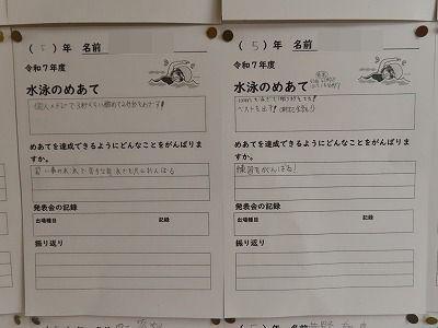 18日は水泳発表会です。かつては水泳大会という行事でした。ガンガン泳がせる指導を行い、町の水泳大会で上位成績をめざしたり、一人一人の記録を伸ばしたりする練習をしてきました。しかし、昨今、飛び込み台も撤去され、競技というよりも安全を第一に考え、着衣水泳を夏の初めに行ったり、命を守るため、水難事故などを想定した「浮かぶ」指導をしたりと、ねらいも変わってきました。本校では、一人一人がめあてをたて、それにむけてどう取り組むかまで決めてから、水泳授業に臨んています。昨年度の記録もしっかり覚えていて、昨年度よりも早くという明確な目標を持っている子供もいました。(写真参照)18日、一人一人のがんばりがあります。是非応援にお越しください。