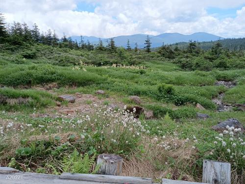 ”西吾妻山市民トレッキング”天元台主催のトレッキングで日本百名山の西吾妻山・人形石・大凹、小凹コースでガイドとして参加した。今年は雪が多く大凹と呼ばれる湿原は雪が残りやすい窪地であり最近まで雪が残ってました・・このため、いつもは終わっているワダスゲ、コバイケソウがいい感じでした・・・・先週7月17日一切経に登ってきて・そこでも雪が残りやす所にはまだコバイケソウ咲いてましたね・・ワタスゲの花言葉は『揺れる想い』。風に揺れるワタスゲの果穂にピッタリな花言葉・・風にフワフワ、ポワポワと揺れる様子を眺めながらこの日はここで昼食となりました・・コバイケイソウは本州中部以北から北海道まで広く分布し、山地から亜高山の草地や湿地などの湿気の多いところに生えるユリ科シュロソウ属の多年草です。6月から7月に山を彩る代表的な高山植物のひとつですが、花は毎年は咲きません。今年は当たり年です・・