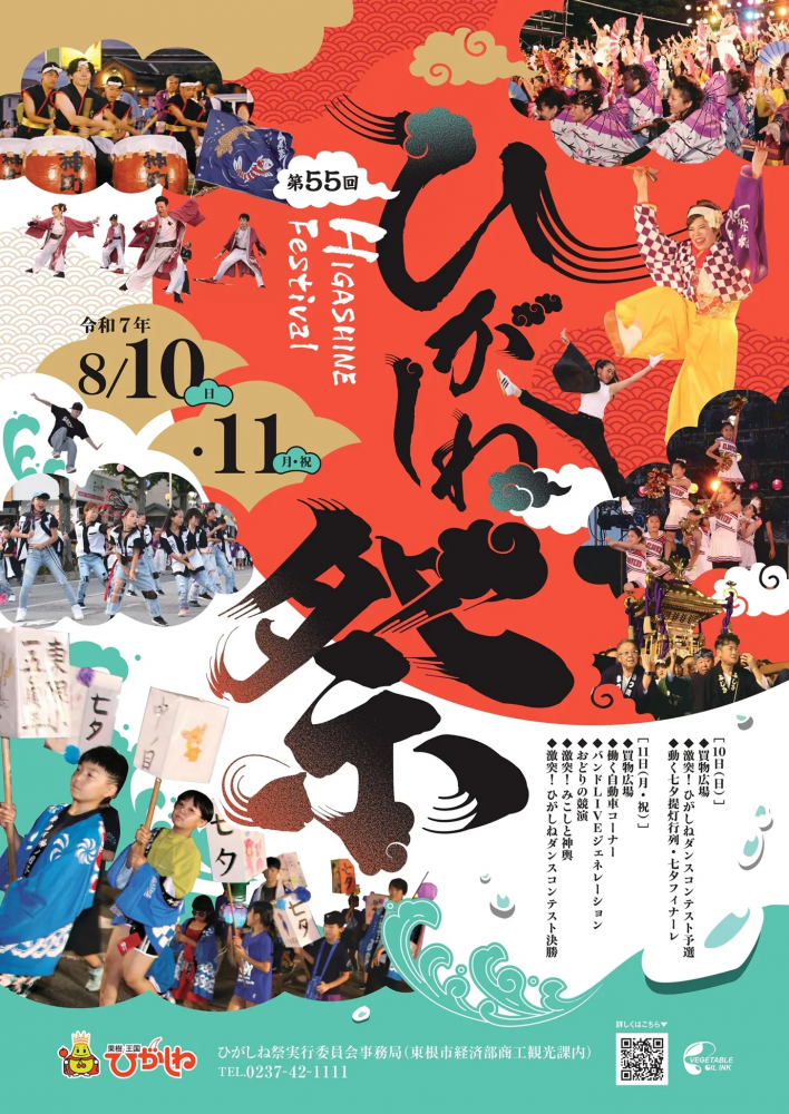 【第55回ひがしね祭 2025】東根の夏を彩る!熱気と感動の2日間を徹底ガイド2025年8月10日・11日の2日間、東根市の夏を熱くする「第55回ひがしね祭」が開催されます。伝統の七夕提灯行列から情熱的なおどりの競演まで、見どころ満載のイベントを徹底ガイドします!東根の夏、いちばん熱い2日間がやってくる! 開催概要 開催日時2025年8月10日(日)・11日(月・祝) 開催場所東根市役所 庁舎周辺 アクセスJRさくらんぼ東根駅東口より徒歩約15分 問合せひがしね祭実行委員会事務局0237-42-1111 (代表) ひがしね祭の3大見どころ!夜空を彩る幻想の光「七夕提灯行列」8/10(日) 18:30〜子どもたちが願いを込めて作った手作り提灯を手に、夏の夜道を練り歩きます。柔らかな光が連なる光景は、どこか懐かししく幻想的。子どもたちが力を合わせた大型山車も必見です!魂がぶつかり合う情熱の舞「おどりの競演」8/11(月・祝) 17:00〜市内外から集まった踊り団体による圧巻のパフォーマンス!伝統的な踊りから創作ダンスまで、様々なジャンルの演舞が3つの特設ステージで繰り広げられ、会場のボルテージは最高潮に!迫力満点!担ぎ手たちの熱き魂「激突!みこしと神輿」8/11(月・祝) 18:50〜「ワッショイ!」という威勢のいい掛け声とともに、勇壮な神輿が練り歩きます。各神輿団体がプライドをかけて担ぐ姿は迫力満点。祭りの熱気を象徴する渡御は、見る者の心も熱く揺さぶります。 まだまだある!その他のイベント買物広場2日間開催!美味しい屋台グルメでお腹も満足。8/10(日)・11(月・祝) 10:00〜21:00激突!ひがしねダンスコンテストハイレベルな戦いに注目!予選 8/10(日) 17:00〜 / 決勝 8/11(月・祝) 18:45〜働く自動車コーナー子どもたちに大人気!記念撮影も。8/11(月・祝) 10:00〜15:00バンドLIVEジェネレーション地元バンドが祭りを音楽で盛り上げる!8/11(月・祝) 11:00〜14:00 アクセスと駐車場情報指定駐車場 (無料) 市役所東側お客様駐車場 タントクルセンター駐車場 東根中部小学校 駐車場 まなびあテラス 駐車場【ご注意】当日は大変な混雑が予想されます。可能な限り公共交通機関をご利用ください。指定場所以外への駐車は絶対におやめください。 よくある質問 (FAQ) 雨が降った場合、お祭りはどうなりますか?イベントにより対応が異なります。「七夕提灯行列」は雨天順延、「働く自動車コーナー」「バンドLIVE」は雨天中止、「みこしと神輿」は雨天決行です。詳細は公式サイト等で最新情報をご確認ください。 駐車場は無料ですか?また、混雑しますか?はい、指定駐車場は無料でご利用いただけます。ただし、当日は大変な混雑が予想されますので、公共交通機関のご利用や、お早めのご来場をおすすめします。 小さな子供連れでも楽しめますか?もちろんです!子どもたちが主役の「七夕提灯行列」や「働く自動車コーナー」など、ご家族で楽しめるイベントが多数あります。買物広場の屋台も楽しめます。イベントの最新情報は公式サイトをご確認ください。ひがしね祭公式サイトはこちら{"@context":"https://schema.org","@graph":[{"@type":"Event","name":"第55回ひがしね祭","startDate":"2025-08-10T10:00:00+09:00","endDate":"2025-08-11T21:30:00+09:00","eventAttendanceMode":"https://schema.org/OfflineEventAttendanceMode","eventStatus":"https://schema.org/EventScheduled","location":{"@type":"Place","name":"東根市役所庁舎周辺","address":{"@type":"PostalAddress","streetAddress":"中央一丁目1番1号","addressLocality":"東根市","addressRegion":"山形県","postalCode":"999-3795","addressCountry":"JP"}},"image":["https://higashine-shikisai.com/assets/images/event-placeholder.jpg"],"description":"山形県東根市で毎年開催される夏祭り「ひがしね祭」。伝統的な七夕提灯行列や迫力満点のみこし渡御に加え、市民参加型のおどりの競演やダンスコンテストなど、老若男女が楽しめるイベントが盛りだくさんの2日間です。","offers":{"@type":"Offer","url":"https://higashine-shikisai.com/h-fes/","price":"0","priceCurrency":"JPY","availability":"https://schema.org/InStock","validFrom":"2025-08-10"},"organizer":{"@type":"Organization","name":"ひがしね祭実行委員会事務局","telephone":"0237-42-1111"}},{"@type":"Article","mainEntityOfPage":{"@id":"https://yamagata-kouiki.info/"},"headline":"【第55回ひがしね祭 2025】山形の夏を彩る!熱気と感動の2日間を徹底ガイド","image":"https://higashine-shikisai.com/assets/images/event-placeholder.jpg","datePublished":"2024-06-20T10:00:00+09:00","dateModified":"2025-09-17T17:00:00+09:00","author":{"@type":"Organization","name":"やまがた広域観光協議会","url":"https://yamagata-kouiki.info/"},"publisher":{"@type":"Organization","name":"やまがた広域観光協議会","logo":{"@type":"ImageObject","url":"https://yamagata-kouiki.info/images/logo.png"}}},{"@type":"FAQPage","mainEntity":[{"@type":"Question","name":"雨が降った場合、お祭りはどうなりますか?","acceptedAnswer":{"@type":"Answer","text":"イベントによって対応が異なります。「七夕提灯行列」は雨天順延、「働く自動車コーナー」「バンドLIVE」は雨天中止となります。「みこしと神輿」は雨天決行です。その他のイベントについては、当日の天候により判断される場合がありますので、公式サイトやSN