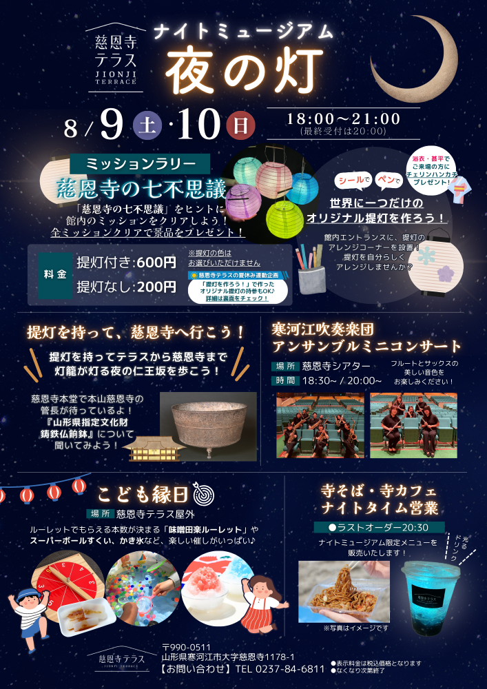 昨年、大好評だった「慈恩寺テラスナイトミュージアム -夜の灯-」を今年も開催いたします!!開催日:8月9日(土)・10日(日)時間:18:00〜21:00(最終受付は20:00)〇ミッションラリー「慈恩寺の七不思議」〇提灯をもって慈恩寺に行こう!〇寒河江吹奏楽団アンサンブルミニコンサート〇こども縁日〇寺そば・寺カフェナイトタイム営業などナイトミュージアムでしか体験できないイベント続々!!詳しくは画像・公式SNSをご覧ください☆2日間だけのスペシャルイベント「慈恩寺テラスナイトミュージアム -夜の灯-」へのご参加お待ちしております