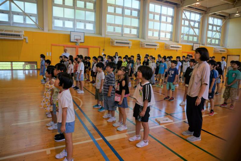 76日間の1学期が終了しました。終業式の前に、先週行われた水泳納会での表彰です。4年男子部における新種目(100M個人メドレー)での記録樹立。おめでとうございます。終業式では、1学期の頑張りと夏休みへの期待を話しました。日々の授業での様子、運動会での頑張り、あいさつの良さを地域の方々から褒めていただいていること等々、まずは1学期の頑張りをみんなで振り返りました。そして、自由な時間の増える夏休み、その時間の使い方が2学期につながっていくことも伝えてところです。児童代表は3年生。1学期に頑張ったことをはきはきと上手に発表することができました。全校生での校歌斉唱も元気いっぱい。気持ちよく夏休みへ入れそうです。さて、学校HPが新しくなりました。本日配付の学校だよりにQRコードがありますので、そちらから入っていただき閲覧してみてください。学校だよりも更新して掲載してきますので、よろしくお願いいたします。