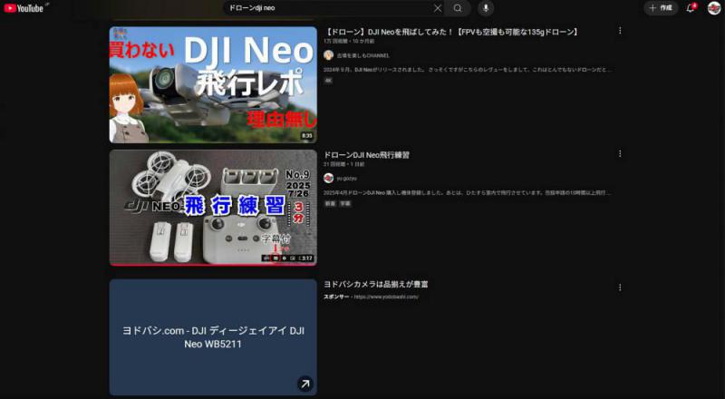 Dji Neo飛行練習をユーチューブにアップしました。20025年4月に購入して、今7月なので3ヶ月になりました。室内ばかりなのですが、毎日楽しく飛ばしています。外での飛行は、飛行許可取りなどの煩わしい手続きがあるので、実現していません。国土交通省DIPSへの機体登録だけは終わっています。画像の真ん中 [Dji Neo飛行練習]が私のチャンネルです。ドローンDJI Neo飛行練習 よかったら見てください。
