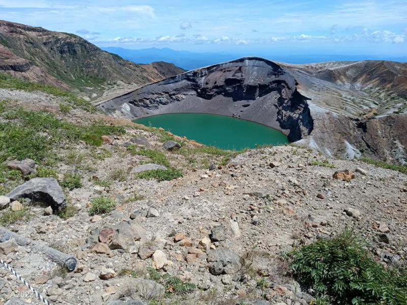 とにかく暑い、どうかしているぞこの天気、あついから涼しいところへと、山友と蔵王へ行く、自宅から13号線で蔵王エコーラインでレストハウス脇、山頂駐車場(有料)まで行かずに、刈田リフト下の無料駐車場で10時集合、そこは1598mと突き上げてくる風が涼しい・・・・しかし、直射日光は強く暑いが日陰場所がない、、唯一トイレが日陰でほんと日陰はいると涼しいです、リフト往復900円を使わずに、登山道で上のメインルートへ、人混みのお釜展望台や刈田岳はパスし、熊野岳頂上へむかう、途中お釜を眺めながらの登山、蔵王の御釜は「刈田岳」「熊野岳」「五色岳」と周囲を3つの山に囲まれた火口湖で、樹氷と並ぶ蔵王のシンボルとなりますね、深緑やコバルトブルーなど太陽の光によって色を変えることから「五色湖」とも呼ばれています。周囲は約1km、直径は約325m、水深は最も深いところで27.6mとされ、強酸性の水のため生物は生息していません。熊野岳山頂へと続く登山道「馬の背」から見る御釜もおすすめですね・・手ぬぐいを頭にかけてその上に帽子かぶってましたが、強烈な日差しは手ぬぐい通り越して後ろ首かなり日焼けした・・うかつでした・・