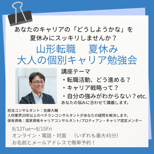 ・転職しようかな〜どうしようかな〜「転職相談」「登録」なんて言われるとちょっとハードルが高いな〜と思ってしまっている・転職前提ではないんだけど、これからのキャリアに迷っている・そんなに温度感高くないんだけど、山形にUターンって、どうなんだろう?・もっと自分のキャリアについて相談したいんだけど、転職エージェントの面談はいつも求人応募の話ばかりになってしまって期待外れ そんな方はいらっしゃいませんか?人材業界に20年身をおいて、国家資格キャリアコンサルタントで、プロティアンキャリア協会認定メンターとして活躍している佐藤大輔がキャリアに関する個別勉強会を実施します。対面、オンライン、お電話、いずれの方法でも可。お子さん同席、ご夫婦で、ご家族一緒に、大丈夫です!みんなで自分の「キャリア」について考える場にしていただくこともできます。 普段のご相談申し込みとは違って「メールアドレス」「お名前」だけでご予約可能になっています。気軽にお話をしてみて、もし「本格的に転職も視野に」ということでしたら、改めてご登録いただきます。 ご予約枠に限りがございますので、お早めにお申し込みください。ご予約はこちらから。ご希望時間帯をクリックしてお申し込みください。 TimerexCalendar();
