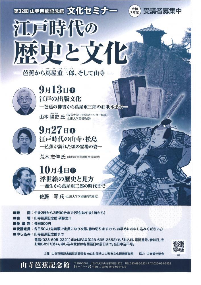 第32回 山寺芭蕉記念館 文化セミナー江戸時代の歴史と文化―芭蕉から蔦屋重三郎、そして山寺―9月13日(土)江戸の出版文化 ―芭蕉の俳書から蔦屋重三郎の狂歌本まで―山本陽史 氏(放送大学山形学習センター所長・山形大学名誉教授) 9月27日(土)江戸時代の山寺・松島 ―芭蕉が訪れた頃の霊場の姿―荒木志伸 氏(山形大学学術研究院教授)10月4日(土)浮世絵の歴史と見方 ―誕生から蔦屋重三郎の時代まで―佐藤琴 氏(山形大学学術研究院教授)■時 間 午後2時から3時30分まで(受付は午後1時から)■会 場 山寺芭蕉記念館 研修室1■受講料 各回500円■定 員 各日50人(先着順で定員になり次第、締め切りますので、お早めにお申し込みください。)■申込み 山寺芭蕉記念館まで電話(023-695-2221)またはFAX(023-695-2552)で、「お名前、電話番号、参加日」を お知らせください。申し込み受付は各開催日の前日まで。当日申込不可。