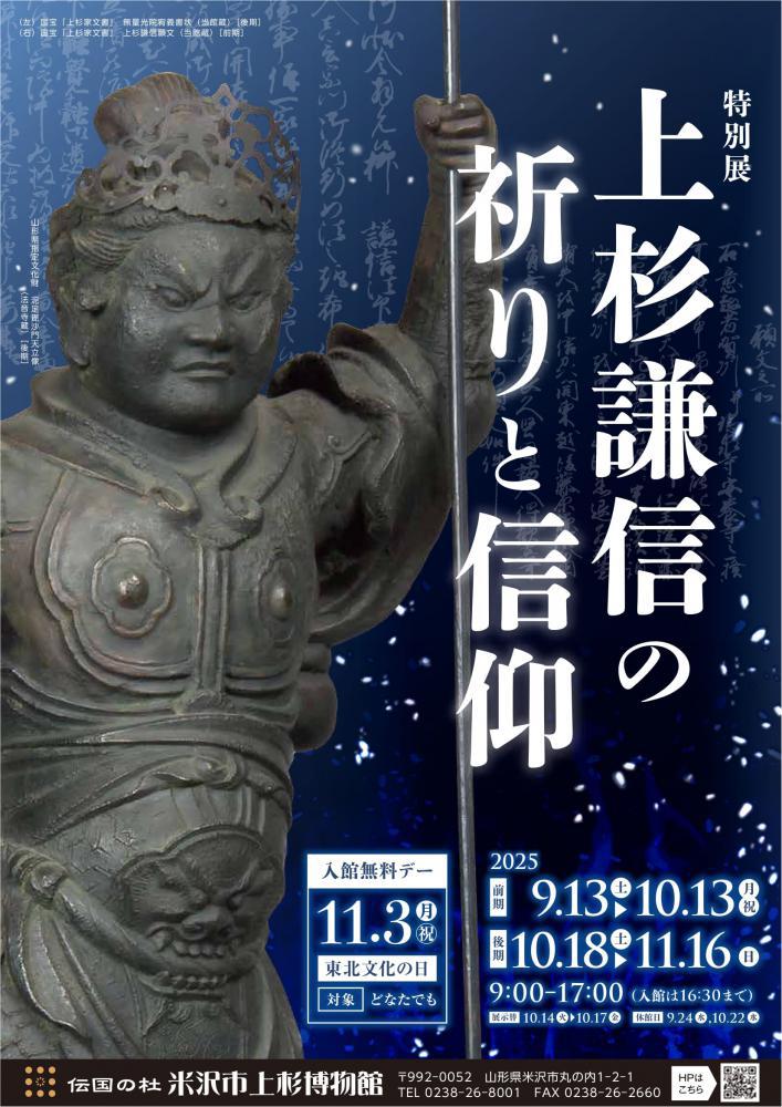 米沢市上杉博物館「特別展 上杉謙信の祈りと信仰」9/13(土)〜11/16(日)開催! 戦乱が数多く繰り広げられた戦国時代は、戦勝を祈念する軍神(いくさがみ)が一挙に勃興した時代でもありました。 この軍神を信仰する形は、武将が身にまとう武具や刀剣に意匠として施されています。上杉謙信も飯縄権現や毘沙門天等の神仏を篤く信仰しており、謙信ゆかりの工芸品にその様相がうかがえます。 また、上杉家は真言宗を信仰する全国的にも数少ない大名家です。この発端は謙信と高野山との密接な関係に求められ、謙信への崇敬とともに江戸時代に引き継がれていきます。特に、米沢城本丸に設けられた御堂は、謙信への崇敬がうかがえる代表的な事例であり、全国的に見ても珍しい城の造りと言えます。 本展では、上杉謙信が信仰した軍神や宗教を主軸に置き、その後米沢藩上杉家に引き継がれていく信仰のかたちを、主に謙信にゆかりある多様な文化財から紹介します。◇開催日時 前期:9月13日(土)〜10月13日(月・祝) 後期:10月18日(土)〜11月16日(日) 9:00〜17:00(入館は16:30まで)◇休館日 9/24(水)・10/22(水)◇入館無料デー 11/3(月・祝)東北文化の日※どなたでも無料◇入館料 一般/800円(640円)高大生/500円(400円)小中生/300円(240円) ※( )20名以上の団体料金、常設展一体型◇ギャラリートーク(担当学芸員による展示解説)〔前期〕9/13(土)・10/4(土) 〔後期〕10/18(土)・11/8(土)時間/14:00〜場所/企画展示室※要特別展入館料・申込不要◇講演会「謙信の軍神、軍神の謙信」※聴講無料日時/10月25日(土)14:00〜場所/伝国の杜2階大会議室定員/80名講師/黒田 智氏(早稲田大学社会科学総合学術院教授)※9月10日(水)9:00より申込受付開始詳細は米沢市上杉博物館ホームページをご覧ください。【お問い合わせ】米沢市上杉博物館 TEL:0238-26-8001〒992-0052 米沢市丸の内1-2-1