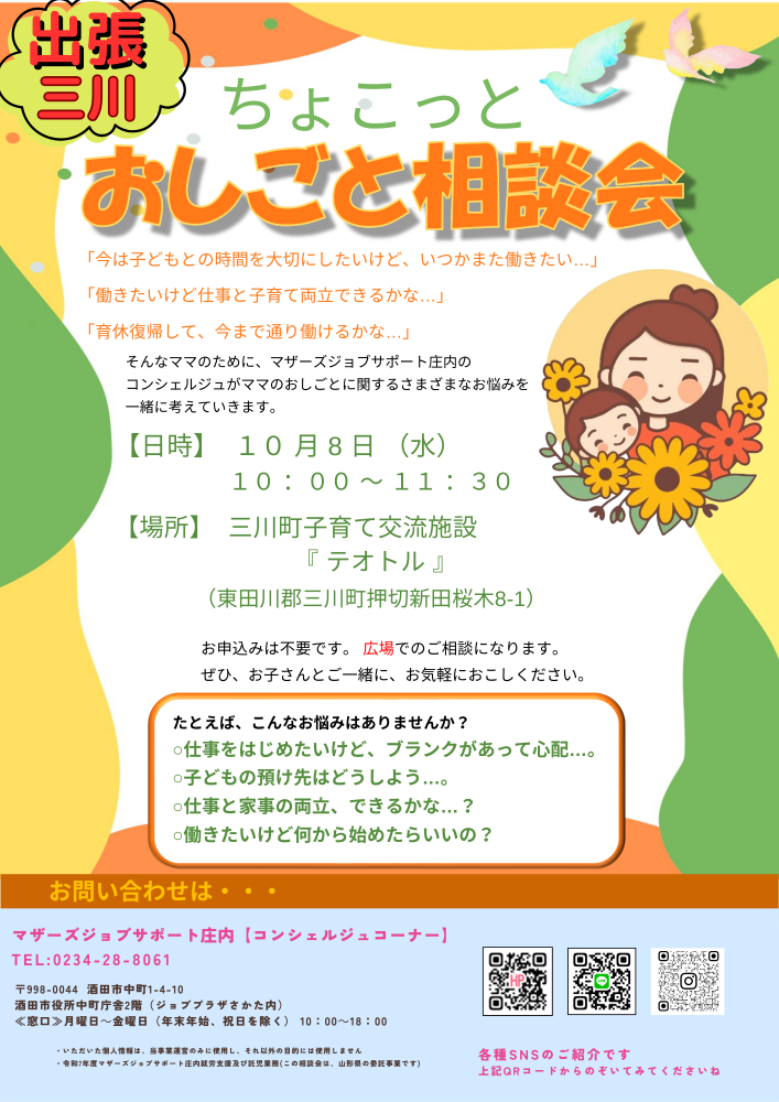「おしごと相談会」10月開催のお知らせです*.:・.。**.:・.。**.:・.。**.:・.。**10月8日(水)@10:00〜11:30 『ちょこっとお仕事相談会!』そろそろ働こうかな...いつか働こうかな...この働き方で続けていけるかな...そんなママのためにマザーズジョブサポート庄内のマザーズコンシェルジュがママのお仕事に関するさまざまなお悩みを一緒に考えていきます一緒に不安を解消したい方、ご興味のある方、ぜひ、ご参加ください(^^)/お申込みは不要ですぜひ、お子さまと一緒にお気軽に遊びに来てください(^^♪【場所】三川町子育て交流施設『テオトル』(東田川郡三川町押切新田桜木8-1) どうぞ、お気軽にお問い合わせくださいね。◇お問い合わせ◇マザーズジョブサポート庄内TEL:0234-28-8061☆★☆コンシェルジュコーナーでLINEアカウントやっております♪              ☆★☆セミナーのお知らせや、お問い合わせ、お申込みにも対応しています♪ぜひお友達になってください☆https://lin.ee/zBnhdYULINEの場合は「お名前、電話番号、申込み講座、託児の有無」を送信して返信をお待ちください