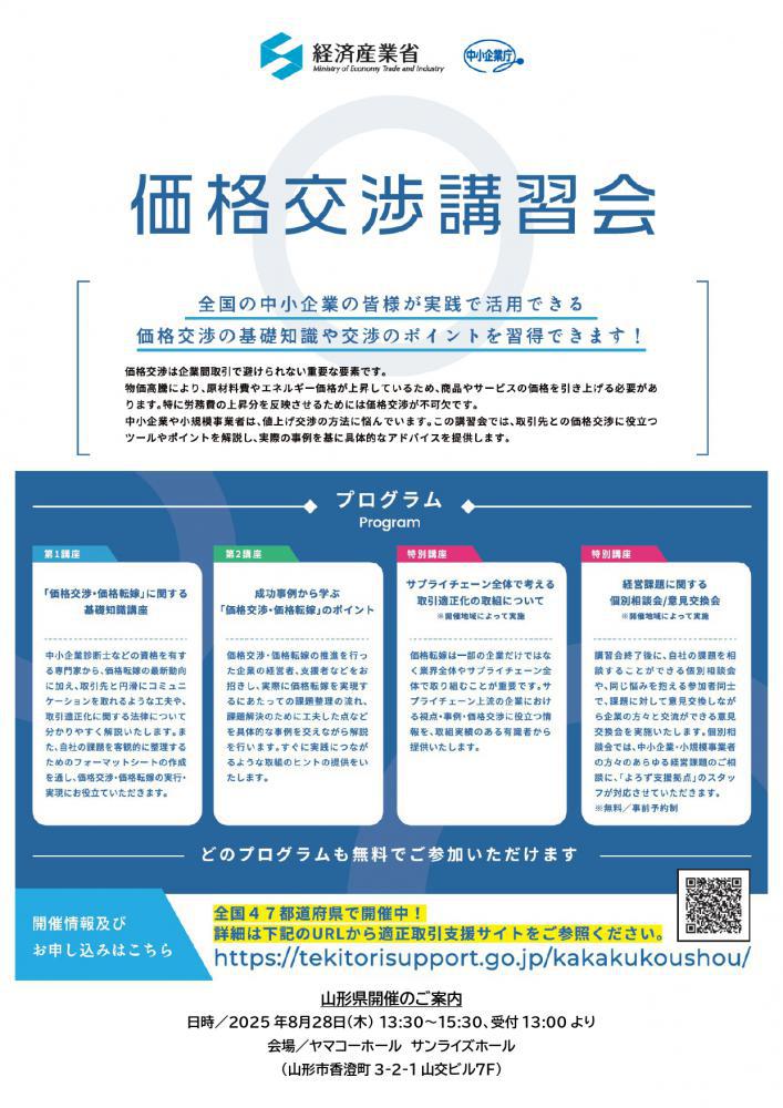 全国の中小企業の皆様が実践で活用できる価格交渉の基礎知識や交渉のポイントを習得できます!1.日時:2025年8月28日(木) 13:30〜15:30、受付13:00より2.場所:ヤマコーホール サンライズホール(山形市香澄町3-2-1山交ビル7F)3.参加費:無料4.内容【第1講座】「価格交渉・価格転嫁」に関する基礎知識講座【第2講座】成功事例から学ぶ「価格交渉・価格転嫁」のポイント5.申込方法:申込サイトから「チケットを申し込む」へお進みください。       中小企業庁【山形】価格交渉講習会 https://kakakuyamagata.peatix.com/view  ※意見交換会/個別相談会にもご参加ご希望の方は、下記をご確認ください。    中小企業庁【山形】価格交渉講習会+個別相談会 https://kakakuyamagatakobetsu1.peatix.com/view       価格交渉講習会事務局 電話:03-6427-9165