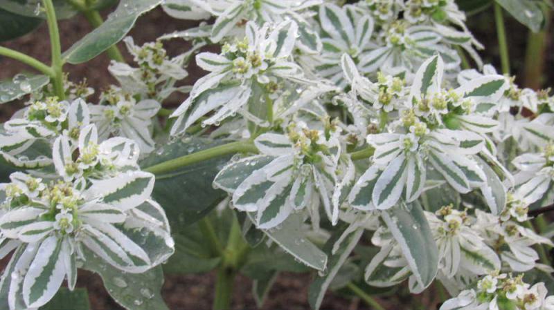 ●雨にうたれた「ハツユキソウ」をみつけました 「ハツユキソウ」と聞くと冬の植物かと思うかもしれませんが 真夏の今 葉のふちが白くなって 雪が降ったかのように見える草花です 花よりも葉の美しさを楽しむ草花です 真夏の暑さや直射日光にも負けない強い植物で毎日暑い日が続く中でも爽やかな白い色で庭を彩っています