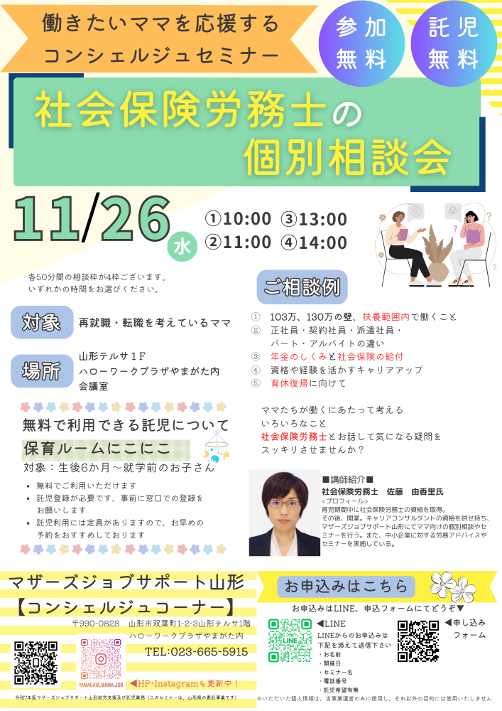 マザーズジョブサポート山形【コンシェルジュコーナー】では社会保険労務士による個別相談会を開催しております。 ◇:*:☆:*:◇:*:☆:*:◇:*:☆:*:◇:*:☆:*:◇@ 103万、130万の壁ってなに?A 扶養の範囲ってどういうこと?B 年金と保険料の仕組みって?C 正社員とパート、どう違うの?D 資格を活かしたキャリアアップって? こんな疑問を解決しませんか?ご相談は、お一人50分間。ご相談料は無料です。ご相談中の託児もご利用いただけます。これから働き始めるうえで知っておきたい基礎知識、損にならない働き方、相談してみませんか?現在、ご自身も子育て中の社会保険労務士 佐藤由香里先生がやさしいママ目線で、ご相談をお受けします!お気軽にお問合せくださいね。 □お問い合わせ□マザーズジョブサポート山形【コンシェルジュコーナー】◇電話でのお申込み→023-665-5915◇お申込みメール→コチラ◇LINEでのお申込み→トーク画面にて・お名前・お申込み講座・託児の有無・お電話番号を送信してください。返信をもって申込完了となります。↓公式LINE追加はこちら↓☆メール・LINE・電話での対応は 開庁日のみとなります。 メール、LINEは開庁時間内で 返信いたします。