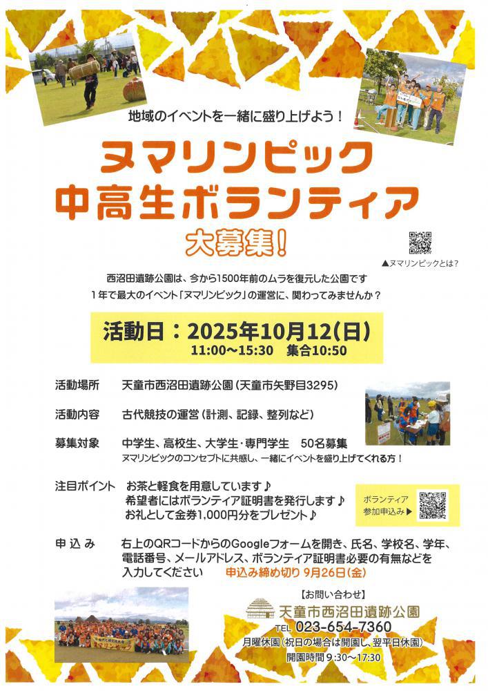 10月12日(日)に天童市西沼田遺跡公園において、1年で最大のイベント「ヌマリンピック」が開催されます。その運営のボランティアスタッフを大募集しています!ヌマリンピックのコンセプトに共感し、一緒にイベントを盛り上げてくれる方、ぜひご参画ください!!☆注目ポイント☆・お茶と軽食を用意しています♪・希望者にはボランティア証明書と発行します♪・お礼として金券1,000円分をプレゼント♪【日時】 令和7年10月12日(日)10:50〜15:30  【場所】 天童市西沼田遺跡公園(天童市矢野目3295)  【募集対象】 中学生、高校生、大学・専門学校生 50名  【申込み】 チラシ記載のQRコードから9月26日(金)までにお申し込みください。※チラシは上記PDFからダウンロードできます↑