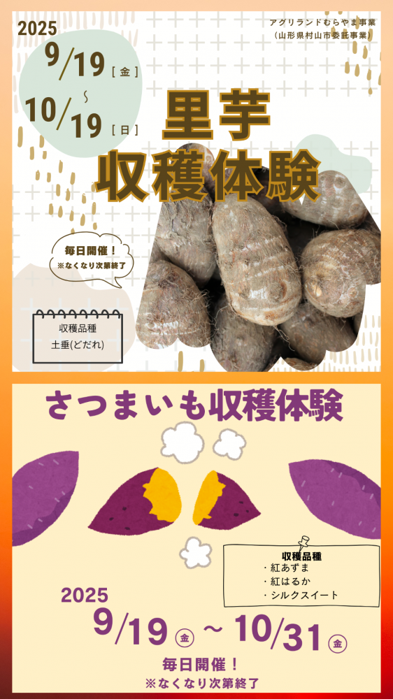 【2025秋・村山】さつまいも&里芋収穫体験!家族で楽しむ味覚狩りガイド - 山形県のほっぺtourism2025年の秋、山形県村山市で土の恵みに触れる「さつまいも&里芋収穫体験」が開催されます!自分で掘り起こした採れたての野菜の味は格別です。家族や友人と一緒に、秋空の下で楽しい思い出を作りませんか? 2つの秋の味覚、どちらを収穫する?同じ会場で、時期に合わせて2種類の収穫体験が楽しめます。どちらも毎日開催、手ぶらで気軽に参加できるのが魅力です。さつまいも収穫体験9/19(金)〜10/31(金)紅あずま・紅はるか・シルクスイートの3品種!甘くてホクホクのお芋を掘り当てよう!里芋収穫体験9/19(金)〜10/19(日)山形の秋の味覚の代表格!ねっとり美味しい土垂(どだれ)を収穫。芋煮にも最適です。 参加するための共通案内 集合場所(株)久里栄人(クリエイト)(山形県村山市大字田沢907-7) 予約体験希望日の3日前までに電話で要予約 申込先(一社)村山市観光物産協会TEL:0237-53-1351(営業時間 9:00〜17:00 / 定休日 土・日・祝) 持ち物軍手、飲み物、帽子、タオル、長靴 未就学児大人と一緒の参加で無料 料金と体験時間さつまいも・里芋、どちらの体験も同じ時間・料金設定です。ご希望の体験と時間帯を選んでご予約ください。時間コース第1部 10:00〜11:00大人:1,100円小中学生:600円第2部 14:00〜15:00大人:1,100円小中学生:600円 嬉しいお持ち帰り付き!さつまいも:大人 5本 / 小中学生 2本里芋:大人 1kg / 小中学生 500g よくある質問 (FAQ)Q.予約は必要ですか?A.はい、必ず体験希望日の3日前までに、村山市観光物産協会へお電話でご予約ください。Q.さつまいもと里芋、両方体験できますか?A.はい、可能です。ただし、それぞれ別々の体験となりますので、ご予約の際に両方体験したい旨をお伝えください。料金もそれぞれ必要となります。Q.どんな服装で行けばいいですか?A.土に触れますので、汚れても良い服装と長靴でのご参加をおすすめします。日差し対策の帽子や、汗拭き用のタオルもお忘れなく。Q.雨が降った場合はどうなりますか?A.小雨の場合は決行しますが、荒天の場合は中止となる可能性があります。天候が心配な場合は、主催者へお問い合わせください。{"@context":"https://schema.org","@graph":[{"@type":"Event","name":"さつまいも収穫体験","startDate":"2025-09-19","endDate":"2025-10-31","eventAttendanceMode":"https://schema.org/OfflineEventAttendanceMode","eventStatus":"https://schema.org/EventScheduled","location":{"@type":"Place","name":"(株)久里栄人(クリエイト)","address":{"@type":"PostalAddress","streetAddress":"大字田沢907-7","addressLocality":"村山市","addressRegion":"山形県","postalCode":"995-0015","addressCountry":"JP"}},"description":"山形県村山市で開催されるさつまいもの収穫体験。紅あずま、紅はるか、シルクスイートの3品種が楽しめます。体験希望日の3日前までに要電話予約。","offers":[{"@type":"Offer","name":"大人","price":"1100","priceCurrency":"JPY"},{"@type":"Offer","name":"小中学生","price":"600","priceCurrency":"JPY"}],"organizer":{"@type":"Organization","name":"(一社)村山市観光物産協会","telephone":"0237-53-1351"}},{"@type":"Event","name":"里芋収穫体験","startDate":"2025-09-19","endDate":"2025-10-19","eventAttendanceMode":"https://schema.org/OfflineEventAttendanceMode","eventStatus":"https://schema.org/EventScheduled","location":{"@type":"Place","name":"(株)久里栄人(クリエイト)","address":{"@type":"PostalAddress","streetAddress":"大字田沢907-7","addressLocality":"村山市","addressRegion":"山形県","postalCode":"995-0015","addressCountry":"JP"}},"description":"山形県村山市で開催される里芋(土垂)の収穫体験。秋の味覚、芋煮に最適な里芋をご自身の手で。体験希望日の3日前までに要電話予約。","offers":[{"@type":"Offer","name":"大人","price":"1100","priceCurrency":"JPY"},{"@type":"Offer","name":"小中学生","price":"600","priceCurrency":"JPY"}],"organizer":{"@type":"Organization","name":"(一社)村山市観光物産協会","telephone":"0237-53-1351"}},{"@type":"Article","mainEntityOfPage":{"@type":"WebPage","@id":"(記事のURL)"},"headline":"【2025秋・村山】さつまいも&里芋収穫体験!家族で楽しむ味覚狩りガイド","author":{"@type":"Organization","name":"山形県のほっぺtourism"},"publisher":{"@type":"Organization","name":"山形県のほっぺtourism"},"datePublished":"2025-09-17","dateModified":"2025-09-17","description":"2025年9月19日から山形県村山市で、さつまいもと里芋の収穫体験が開催!紅はるか等の人気品種も。料金、時間、予約方法を完全ガイド。秋の行楽は、家族みんなで土に触れる楽しい思い出作りをしませんか?"},{"@type":"FAQPage","mainEntity":[{"@type":"Question","name":"予約は必要ですか?","acceptedAnswer":{"@type":"Answer","text":"はい、必ず体験希望日の3日前までに、村山市観光物産協会へお電話でご予約ください。"}},{"@type":"Question","name":"さつまいもと里芋、両方体験できますか?","acceptedAnswer":{"@type":"Answer","text":"はい、可能です。ただし、それぞれ別々の体験となりますので、ご予約の際に両方体験したい旨をお伝えください。料金もそれぞれ必要となります。"}},{"@type":"Question","name":"どんな服装で行けばいいですか?","acceptedAnswer":{"@type":"Answer","text":"土に触れますので、汚れても良い服