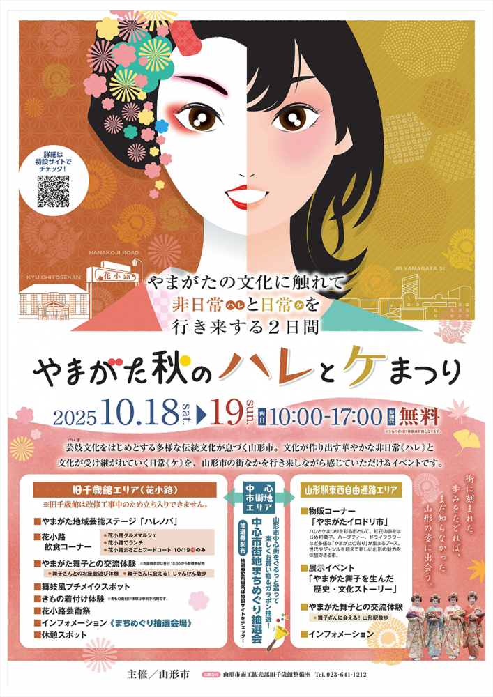 【入場無料】やまがた秋のハレとケまつり2025!やまがた舞子と伝統文化を体験する2日間山形市に息づく伝統文化の魅力を存分に体験できる「やまがた秋のハレとケまつり」が2025年10月18日(土)と19日(日)に開催されます!華やかな非日常(ハレ)と、日々の暮らしに根ざした文化(ケ)を、山形市の街なかで感じられる特別な2日間。やまがた舞子との貴重な交流体験や物販・グルメコーナー、きもの着付け体験など大人から子どもまで楽しめるコンテンツが盛りだくさんです。入場無料ですので、ぜひこの機会に秋の山形へお越しください! イベント概要  開催日時 2025年10月18日(土)・19日(日) 10:00〜17:00  開催場所 中心市街地エリア  旧千歳館エリア (花小路) 山形駅東西自由通路エリア ※旧千歳館は改修工事中のため、立ち入りできません。  入場料 無料  その他 雨天決行(荒天中止の場合あり)  お問い合わせ 山形市商工観光部旧千歳館整備室 (TEL: 023-641-1212)  イベントHP https://yamagata-aki.jp/  主催・協賛 主催: 山形市  一口メモ山形市の伝統や文化が凝縮された、まるでタイムスリップしたかのような体験ができるのがこのお祭りの魅力!特にやまがた舞子との交流は、普段なかなかできない貴重な経験です。やまがた舞子の艶やかな舞や、一緒に遊べるじゃんけん勝負は、きっと旅の忘れられない思い出になるはず。美しい秋の山形で、心温まる非日常をぜひ味わってみてくださいね! 会場別プログラム詳細 旧千歳館エリア (花小路)※旧千歳館は改修工事中のため、立ち入りできません。  やまがた地域芸能ステージ「ハレノバ」 伝統と現代が融合したパフォーマンスをお楽しみください。  花小路飲食コーナー  地元の美味しいグルメや特産品が大集合!食べ歩きも楽しめます。キッチンカーもやってきます。  やまがた舞子との交流体験 (各日限定2回、お座敷遊びは10:30から整理券配布) 舞子さんとのじゃんけん勝負やお座敷遊び体験など、貴重な体験ができます。  舞妓風プチメイクスポット 舞子風メイクを体験できるスポット。  きもの着付け体験(要事前予約・有料) 日本の伝統衣装である着物を着て、街歩きを楽しめます。  インフォメーション《まちめぐり抽選会場》 イベント参加で豪華景品が当たるチャンス!  休憩スポット 散策の合間に一息つける場所です。 山形駅東西自由通路エリア  やまがたイロドリ市 紅花染めや木工品、焼き物、手芸品など、山形ゆかりの美しい工芸品が集まる市。作り手の想いが詰まった逸品に出会えます。  歴史イベント「やまがた舞子を生んだ歴史・文化ストーリー」 やまがた舞子の誕生秘話や文化的な背景を知ることで、より深く山形に触れられます。  やまがた舞子との交流体験  インフォメーション イベント案内や周辺情報を提供します。 よくあるご質問 (FAQ)Q1: イベントへの入場は無料ですか?▼はい、入場は無料です。ただし、一部の体験プログラムでは整理券が必要となる場合があります。Q2: 旧千歳館エリアには入れますか?▼旧千歳館は現在改修工事中のため、立ち入りできません。周辺の花小路エリアで様々なプログラムをお楽しみいただけます。Q3: やまがた舞子との交流体験はどのように参加できますか?▼やまがた舞子との交流体験は、旧千歳館エリア(花小路)で各日2回、山形駅東西自由通路エリアで各日1回を予定しています。旧千歳館エリア(花小路)で実施するお座敷遊び体験では、各日10:30から先着順で整理券を配布します。詳細はイベントHPをご確認ください。Q4: イベントに駐車場はありますか?▼イベント専用の駐車場は設けられておりません。公共交通機関のご利用をおすすめしますが、お車でお越しの際は、周辺のコインパーキングをご利用ください。/* カスタムアコーディオンのスタイル */.accordion-toggle:checked + .accordion-header .accordion-icon { transform: translateY(-50%) rotate(180deg);}.accordion-toggle:checked ~ .accordion-content { max-height: 500px; /* アコーディオンが開いたときの高さ */ overflow: visible; transition: max-height 0.5s ease-out;}.accordion-content { max-height: 0; overflow: hidden; transition: max-height 0.5s ease-out;}/* Font Awesome 6 Free のスタイル */@font-face { font-family: 'Font Awesome 6 Free'; font-style: normal; font-weight: 900; font