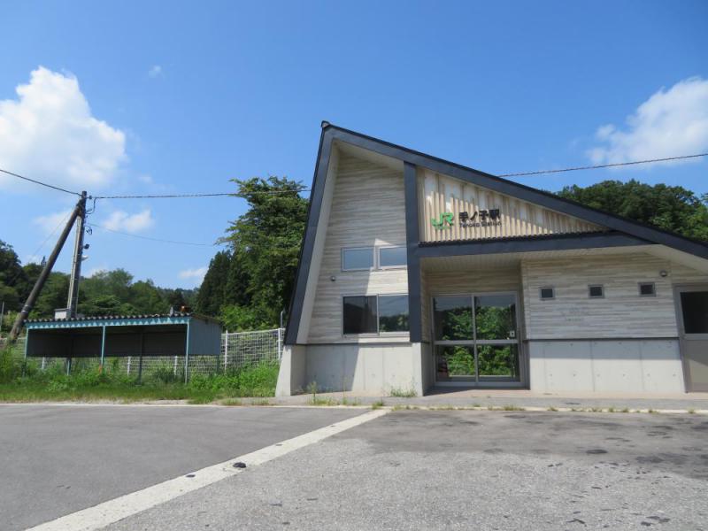 手ノ子駅は1931年(昭和6年)8月10日、米坂東線(今泉〜手ノ子)開通時に開業。2020年(令和2年)12月21日、現駅舎が完成した。8駅の中で最も新しくモダンなデザインの駅舎である。駅前には食堂や公衆電話、農協事務所跡などが見られ、往時の賑わいを感じさせる風情が残っている。 ※手ノ子駅開業時の記事はこちら → 手ノ子駅(米坂線)開業記念の写真:おらだの会     飯豊町史によれば手ノ子は大永元年(1527年)に開設された越後街道の宿駅の一つであり、常備の伝馬数は36頭で領内では上小松に次ぐ規模であったといいます。駅名にもなった「手ノ子」の由来の一つに、手子(てご)と呼ばれる荷負人夫が集落にいたため、との説もあるようです。 2020年(令和3年)に策定され、2030年(令和12年)を目標とした手ノ子地区計画書の中の「現状と課題」の中に、米坂線に触れられた項目がありました。///近い将来、新潟山形南部連絡道路(新山道路)が整備される。米坂線開通と宇津トンネル開通が地域衰退の引き金になった手ノ子地区にとって新山道路は、三度目の地域衰退の原因になるのでは、と心配する。それを乗り越えるインフラ整備など地域振興策が求められる。///  手ノ子を出ると宇津峠に向かう。SLの時代は、全国から鉄道ファンが駆けつけた撮影スポットである。全国的な人口減少時代にあって、地域は厳しい対応を迫られている。けれども手ノ子駅は、建設後5年しか経っていない。宿駅の町の新しい駅である。このまま歴史に埋もれさせるのは悲しすぎる。