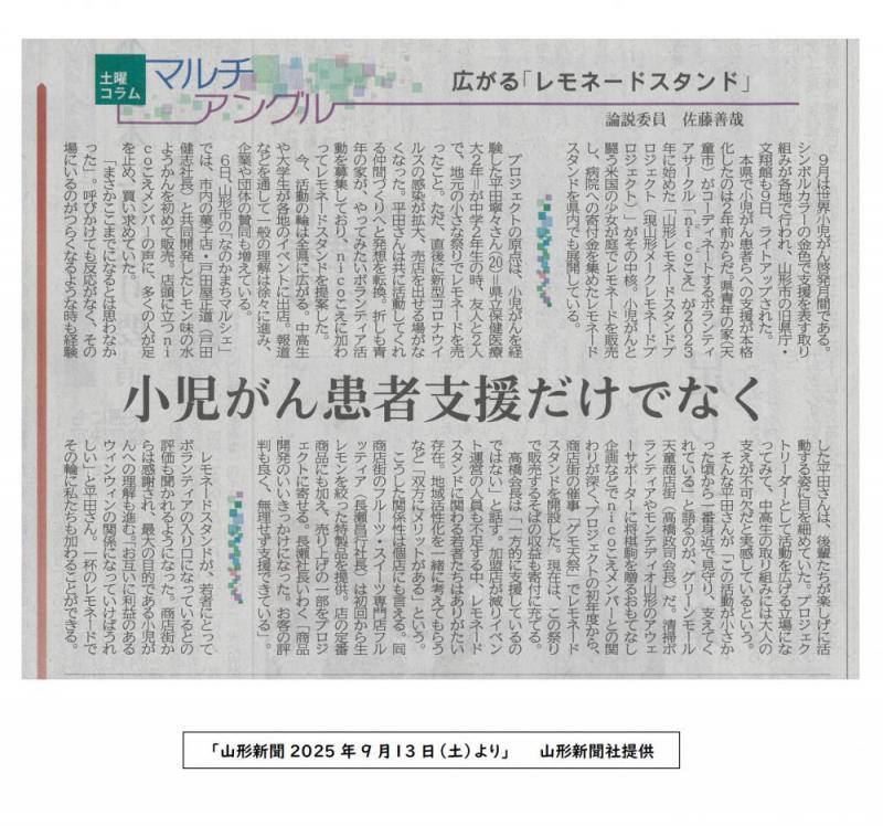 このたび、ボランティアサークル「nicoこえ」のこれまでの活動および取り組んできたプロジェクト「山形Make Lemonadeプロジェクト」が、山形新聞(2025年9月13日付)に紹介されました。記事では、これまでの小児がん患者支援に加え、地元商店街との連携を通じた地域活性化の取り組みについても詳しく紹介されています。紙面画像は上記PDFをご覧ください↑