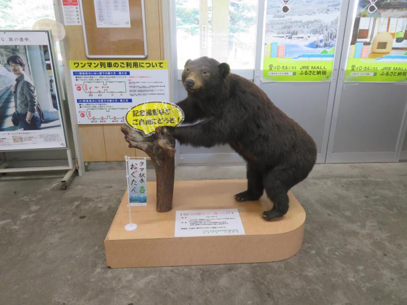 小国駅は1935年(昭和10年)10月30日に開業。米坂線でも貴重なJR直営の有人駅である。赤屋根と白壁のコントラストが美しく2002年(平成14年) に旧長井駅や荒砥駅と共に「東北の駅百選」に選定されている。米屋こうじさんは「昔の役場のような風格ある建物が風景に良く似合っている。」と評している。(「鉄道ファイル」2008年)  待合室に入ると、すべての窓にはカーテンが引かれていたが、隙間から事務室の灯りが見えた。運休となった今でも、職員が働いているのだろう。そんな気配を感じられただけでも嬉しかった。そして正面には「クマ駅長おぐたん」が鎮座している。最近でこそ「クマ」はとても迷惑な存在となっているが、小国町はマタギ文化を柱の一つにしながら、熊祭りなどをとおして地域活性化に取り組んでいたのである。  クマ駅長の台座には町観光協会と小国駅長の名前があった。「駅からハイキング」などJRと地域の協同事業が行われていたが、「クマ駅長おぐたん」は駅と町の協働の歴史を伝えるもののような気がした。列車が止まっている今、クマ駅長は何を思うのだろうか。