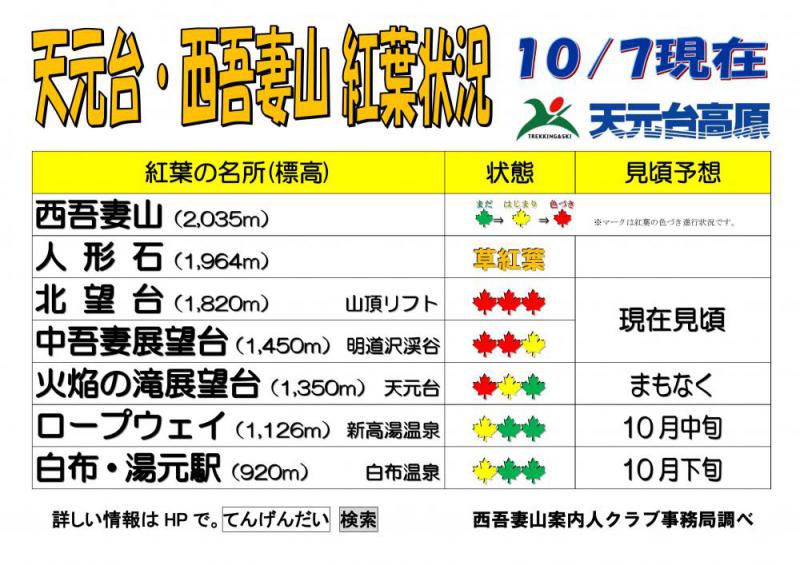 天元台・西吾妻山の10/7時点の紅葉状況です。人形石方面はまるで綺麗な絨毯のような景色が広がっております。天元台高原 北望台 周辺が現在見頃です!『しゃくなげロマンスリフト』の乗り場前の中吾妻展望台から見る明道沢渓谷も色付き始めました。週末にかけて天元台高原の火焔の滝展望台方面も色付きが予想されます。ぜひ秋の天元台高原にお越しください!※夏山営業は10月26日(日)までです。【お問い合わせ】天元台高原 TEL:0238-55-2236