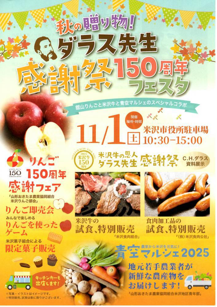 秋の贈り物!「ダラス先生感謝祭150周年フェスタ」舘山りんごと米沢牛と青空マルシェのスペシャルコラボ 11/1(土)開催!チャールズ・ヘンリ―・ダラス氏と関わりがあり、今年で共に150周年を迎える舘山りんごと米沢牛、若手農家による軽トラ市の1日限定のコラボイベントを開催します。多くの方のご来場、お待ちしております。■日時11月1日(土曜日)10時30分〜15時■場所米沢市役所駐車場■ 内容1.りんご150周年感謝フェアりんご即売会、りんごを使ったゲーム、米沢菓子組合による限定菓子販売など2.米沢牛の恩人ダラス先生感謝祭米沢牛特別販売、米沢牛焼肉試食、ダラス資料展示3.青空マルシェ2025若手農家による軽トラ市4.キッチンカーによる飲食販売【お問い合わせ】米沢市農業まつり実行委員会(米沢市産業部農業振興課)TEL:0238-22-5111(内線4300)